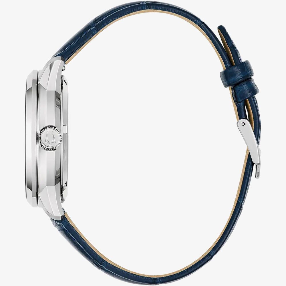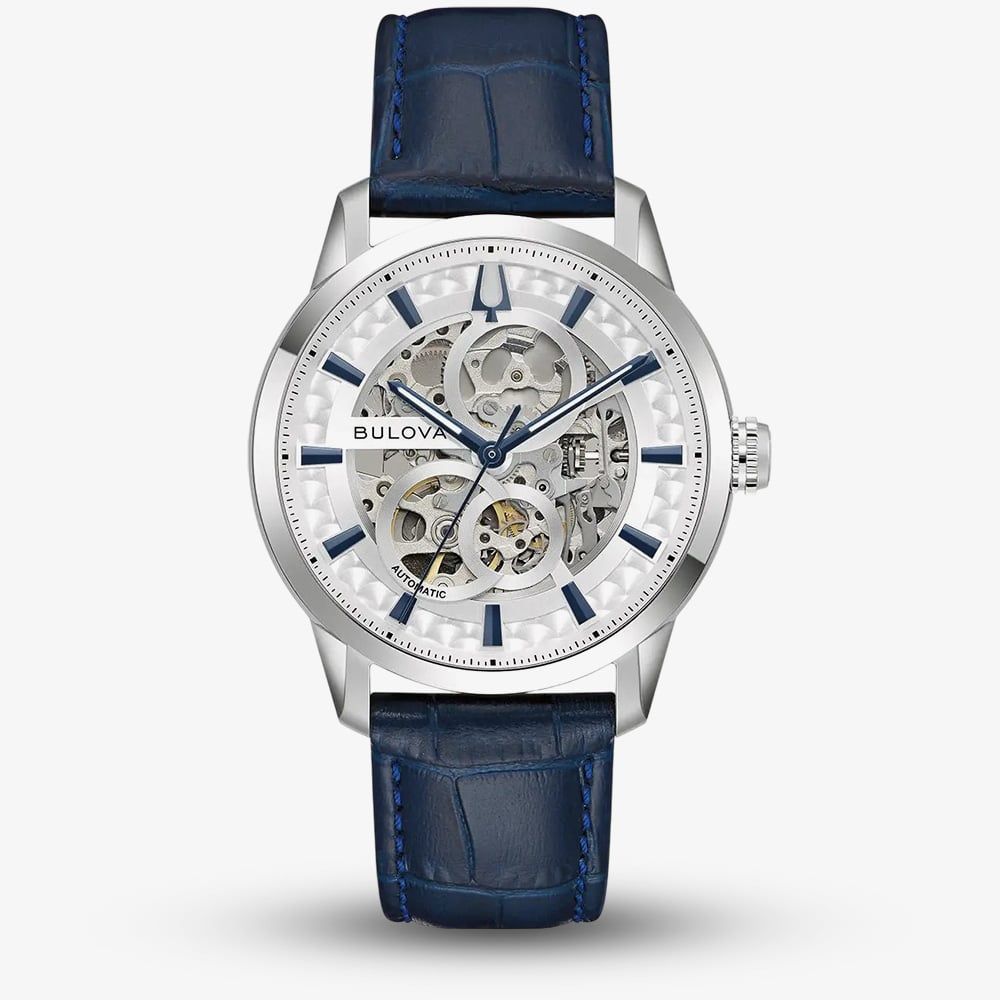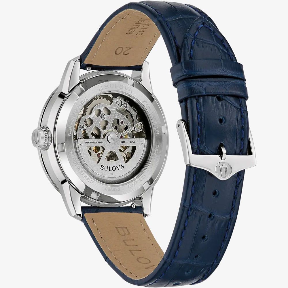Bulova Mens Sutton Automatic Blue Skeleton Dial Leather Strap Watch 96A330