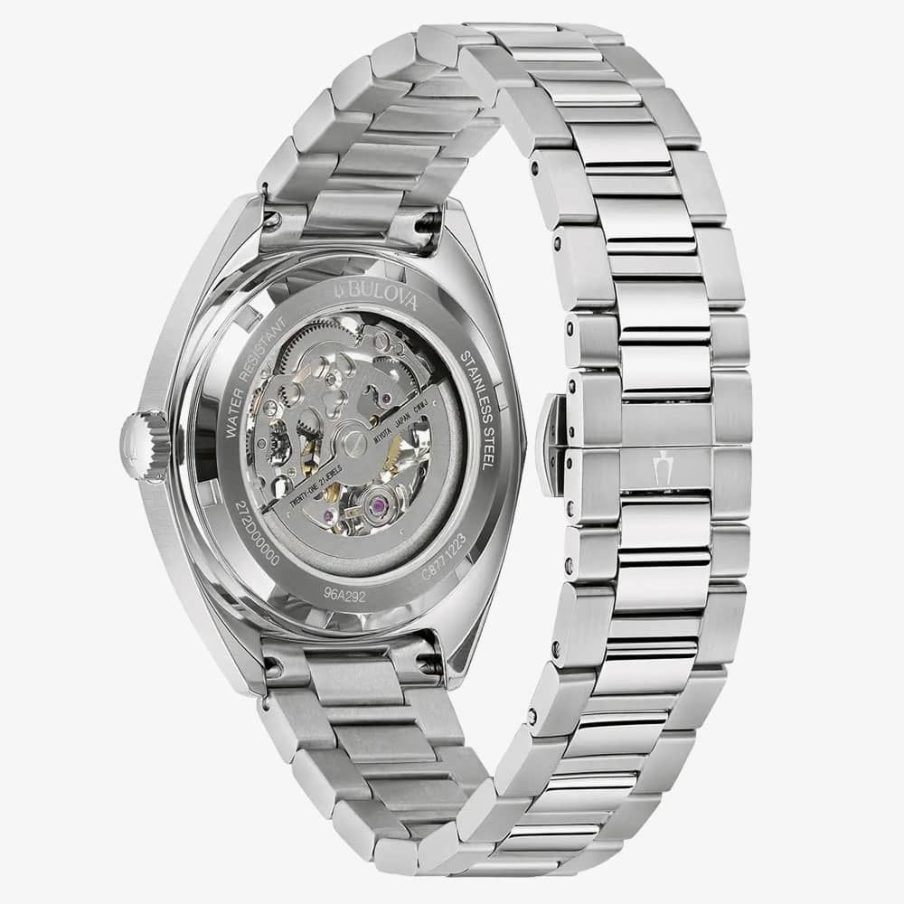 The Bulova Surveyor Skeleton Watch is crafted with precision from stainless steel. This timepiece showcases a captivating skeleton dial in blue, revealing the intricate automatic movement within.