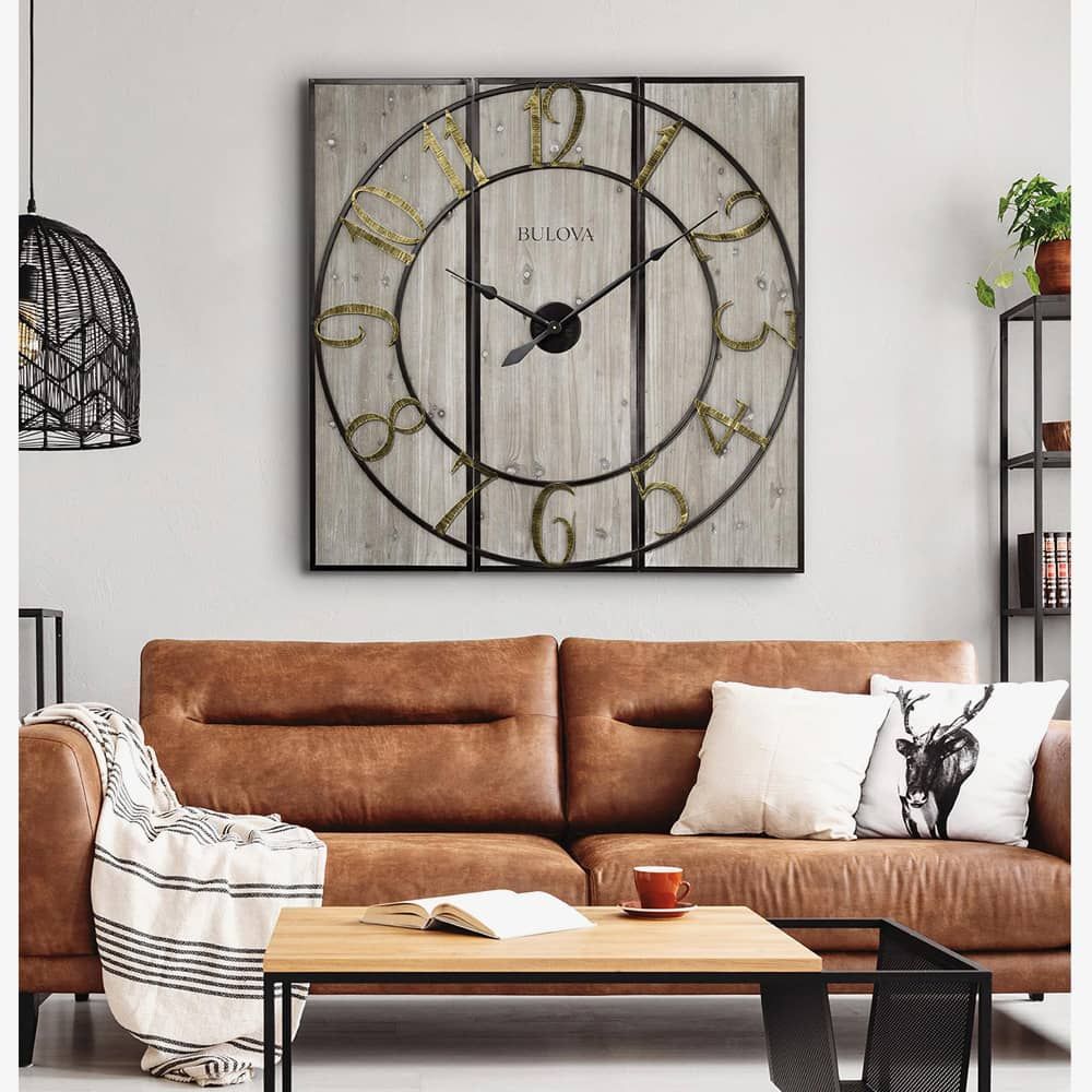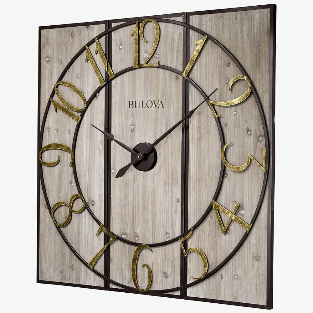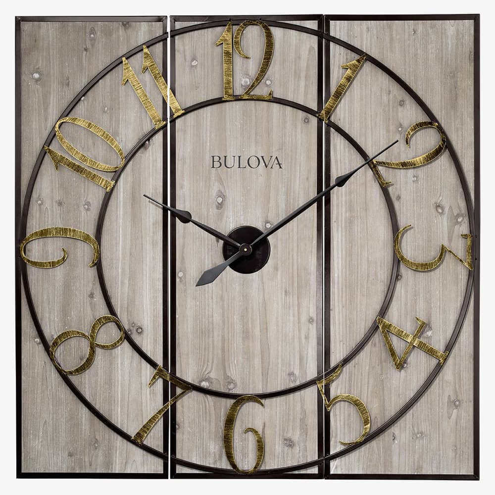The Bulova C4113 square shaped Vermont Country wall clock is made from wood and is powered by 1 x C battery (not included). It is finished with a light grey stain, has antiqued gold tone Arabic numerals, and is shipped in 3 pieces for ease and convenience. A separate mounting bar is also included making it easy to hang.