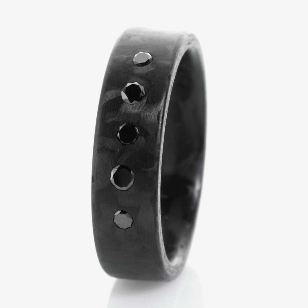 Representing the line of your life moving from your past, through your present and into the future, five stone rings are iconic and beautiful. Utilising alternating sizes of stone, the Black Five ring is subtle, symmetrical and sophisticated, a truly unique long-lasting alternative to precious metal bands.