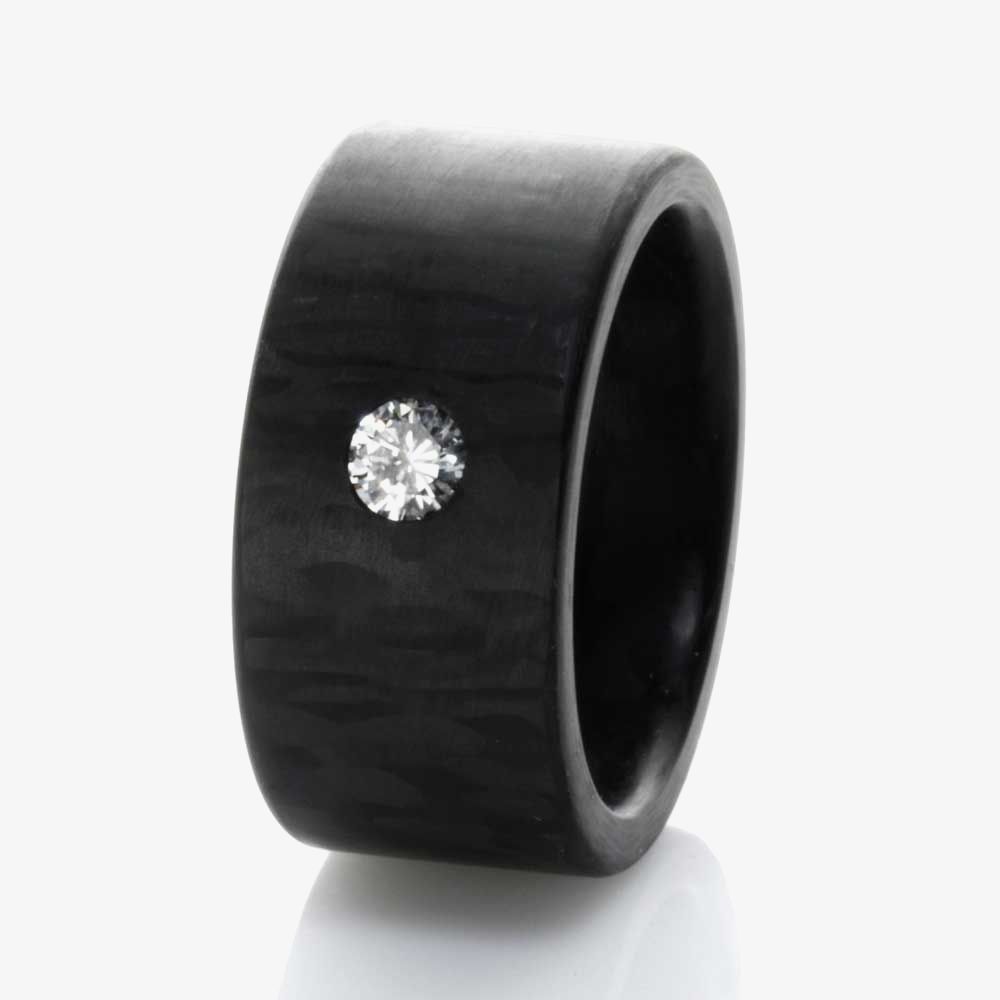 Bright as light with an inner fire, a single perfect diamond is set into the strong carbon to add a subtle shine to your day.