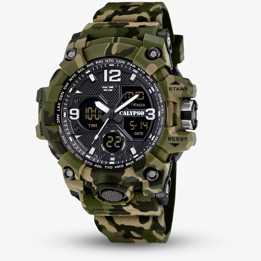 • 50 metre water resistance.Calypsohttps://www.thbaker.co.uk/media/catalog/product/2/1/21-92-25157502_calypso_model_01.jpg8430622826283add-to-cartcondition:Nodisc_no_stock:Noex_display:NoNoNoNo219225157502CalypsoK5855/3MensOfficial Calypso Packaging2 Year Calypso WarrantyClassicNoWatchGreenRubber StrapPlasticRound56.0mmDual DisplayPlasticBlackBlack50 metresQuartzPin BuckleNo StoneNo StoneYesNoNoNoYesYesNo{"name":"Klarna","text":"Pay In 30 Days","imageUrl":"https:\/\/www.thbaker.co.uk\/media\/nosto\/klarna.png"}Calypso Mens X Trem Green Camouflage Dual Display Watch21-92-251575022026-03-26 00:00:000[{"path":"\/Watches","url":"\/watches\/"},{"path":"\/Watches\/Mens Watches","url":"\/mens-watches\/"},{"path":"\/Watches\/Digital Watches","url":"\/digital-watches\/"},{"path":"\/Watches\/Plastic Watches","url":"\/plastic-watches\/"},{"path":"\/Watches\/Quartz Watches","url":"\/quartz-watches\/"},{"path":"\/Watches\/Classic Watches","url":"\/classic-watches\/"},{"path":"\/Watches\/Colourful Watches","url":"\/colourful-watches\/"},{"path":"\/Watches\/Colourful Watches\/Green Watches","url":"\/green-watches\/"},{"path":"\/Brands A-Z\/Calypso Watches","url":"\/calypso-watches\/"}]2026-03-26