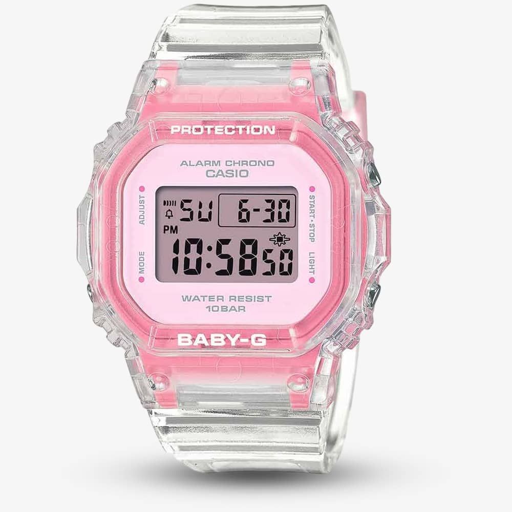 The compact BGD-565 model boasts a chic square design that combines trendiness with practicality. Featuring a translucent bezel and a band inspired by the Y2K fashion palette, this watch blends lustrous clear shades with a matte finish in vibrant colours. Its dimensions of 42.1 x 37.9 x 11.3 mm and durable resin construction make it a perfect, stylish addition to your summer wardrobe.