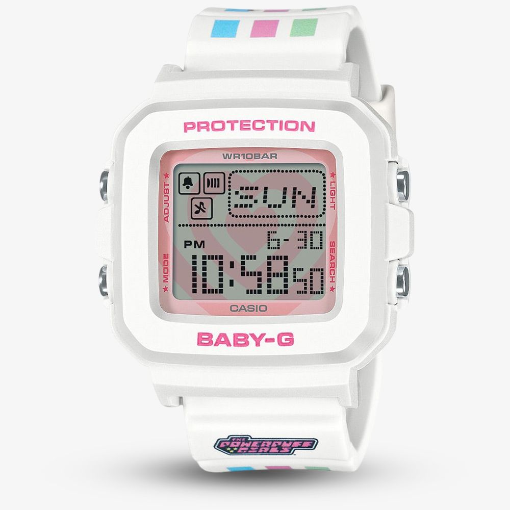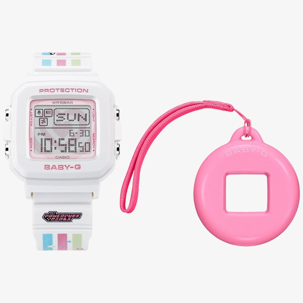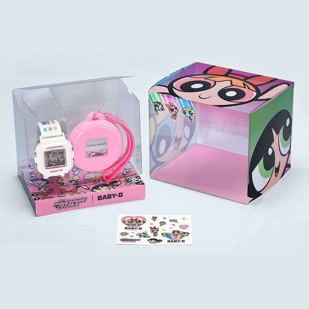 A cute and stylish timepiece that celebrates the iconic cartoon trio. This digital watch features a white plastic strap that showcases images of Blossom, Bubbles, and Buttercup, while the pink digital display is decorated with the Powerpuff Girls' heart mark. This watch also comes with a detachable element that can be hung on your clothing or bag and a sheet of original Powerpuff Girls stickers that you can use for decoration. With its shock resistance, 100 meter water resistance, and various functions like alarms, a countdown timer, and a stopwatch, this watch is both practical and fun.