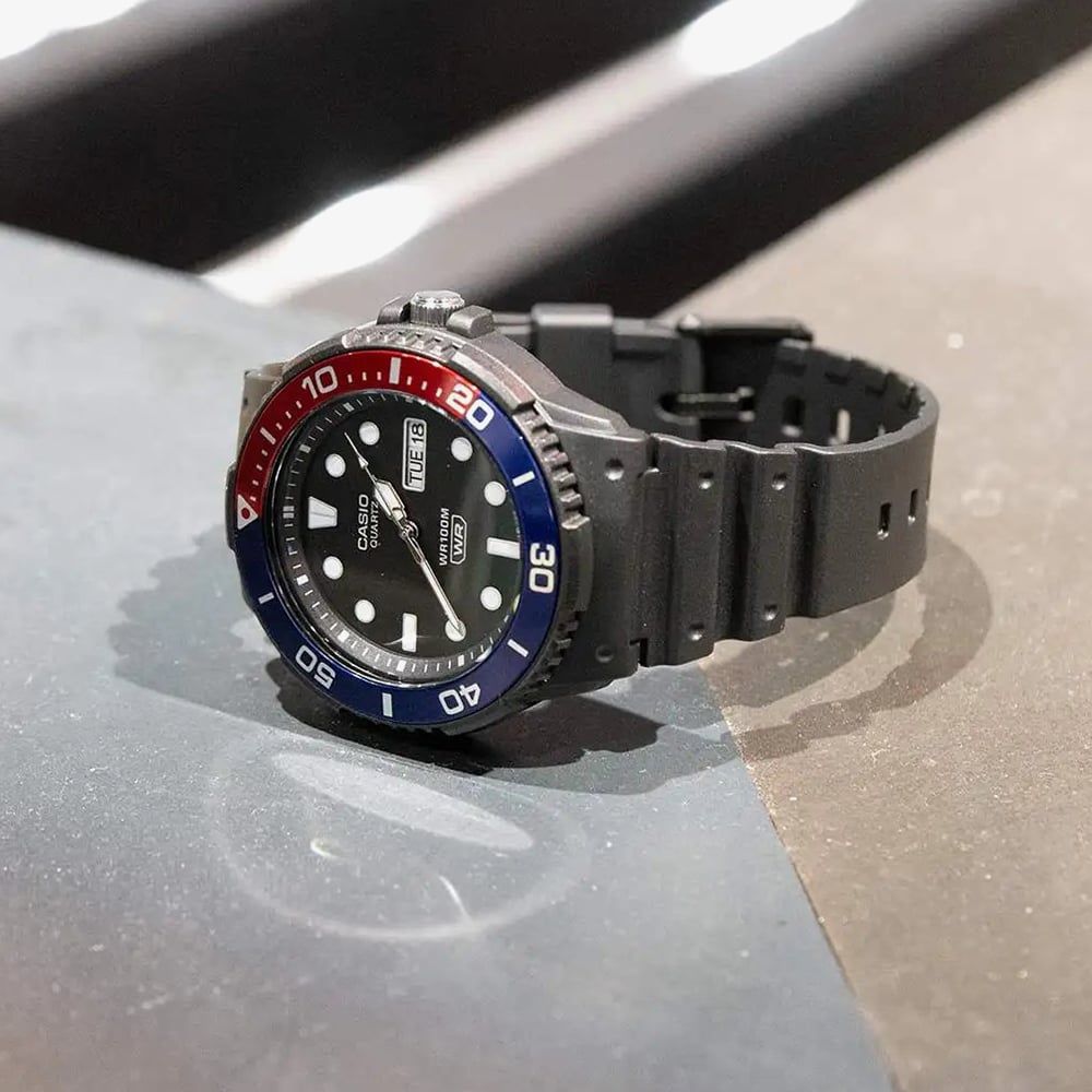 Our latest analogue watch collection draws inspiration from marine design, featuring sleek rotary bezels with shimmering aluminium rings. With 100-meter water resistance, a day and date display, and practical features, these timepieces blend style with everyday reliability.