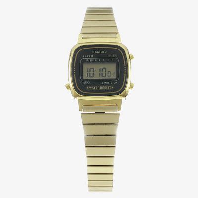 This classic timepiece from Casio features an LCD digital display housed inside a square resin case. A stainless steel bracelet and fold over clasp accompanies the piece, which also possesses a stopwatch, a timer with a 30 minute limit and an automatic calendar displaying the correct date at all times once set. Acrylic glass protects the dial, resulting in a fashionable timepiece with many extra features.