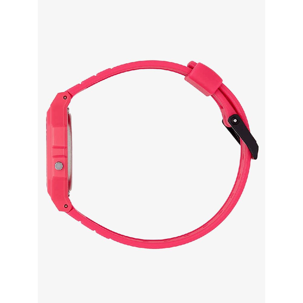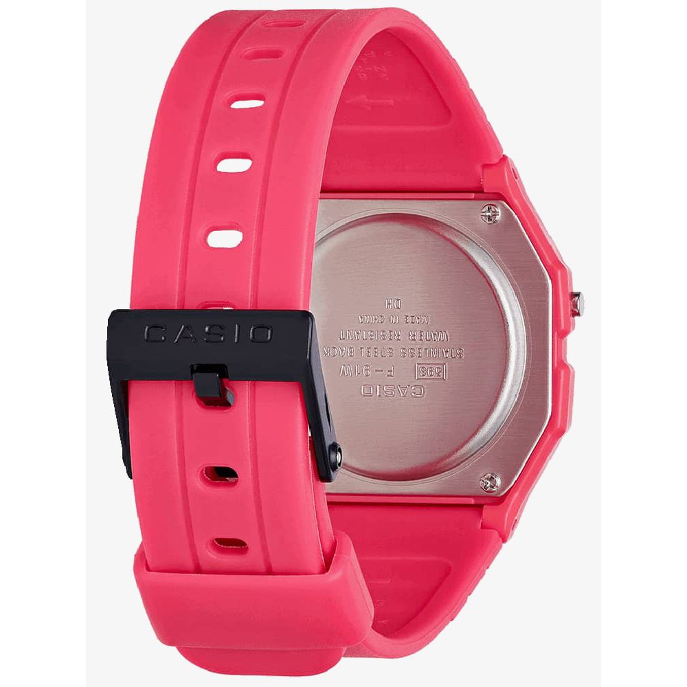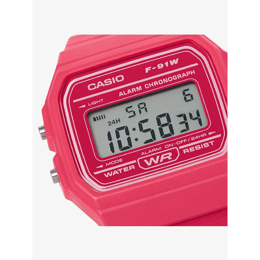 The F-91WC-4AEF Casio Collection watch combines a 35.2mm square shaped resin case and pink resin strap with a traditional buckle. It has a digital dial which is protected beneath plastic glass. Power is generated by the quartz movement. This model is also splash resistant.