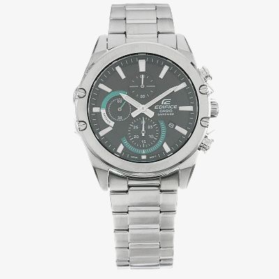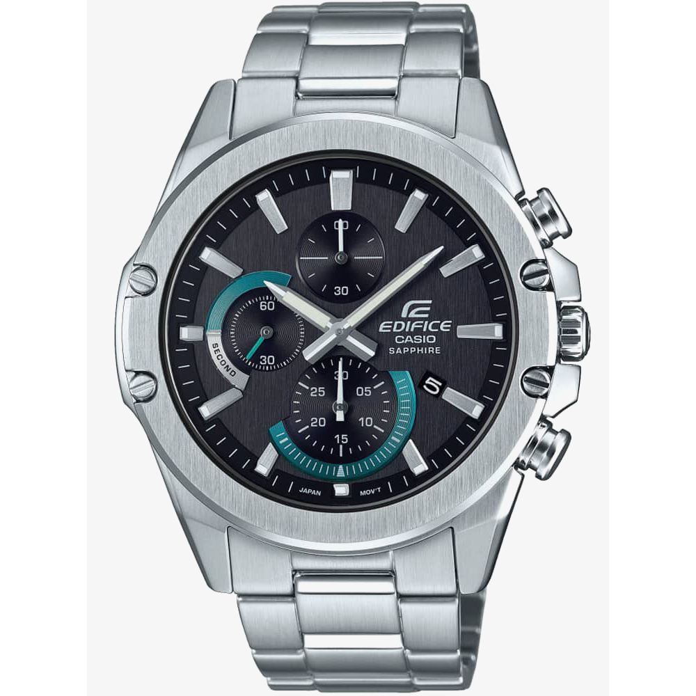 A Casio Edifice Classic Collection watch composed of a stainless steel case and bracelet with fold over clasp. This silver watch has a black textured dial with subtle touches of light blue, as well as luminescent hands, a date display, and chronograph sub-dials, all of which are powered by a quartz movement. Scratch resistant sapphire crystal also protects the dial.