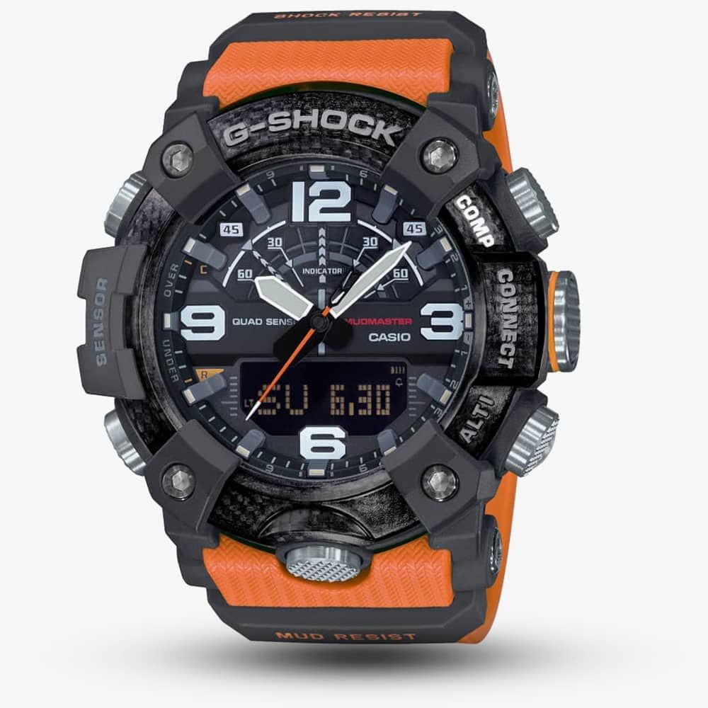 https://www.thbaker.co.uk/casio-g-shock-master-of-g-mudmaster-carbon-core-guard-dual-display-orange-plastic-strap-smartwatch-gg-b100-1a9er86632Casio G-Shock Master Of G Mudmaster Carbon Core Guard Dual Display Orange Smartwatch GG-B100-1A9ERhttps://www.thbaker.co.uk/media/catalog/product/2/1/21-43-250_01.jpg349349GBPOutOfStock/testing-categories/Test_Andrew/THB-1888-Casio-Ranges/THB-1888-Casio-Internet773012642871497722G-SHOCK BLK/ORNG SW DY/DT A Casio Mudmaster watch composed of a black carbon fibre reinforced case and orange resin strap with a buckle clasp. This impressive watch is designed to endure an even higher level of toughness and withstand the harshest land environments. The new extreme shock resistant Carbon Core Guard structure integrates the case and back cover into a single carbon Monocoque unit to protect against severe impact. Strong, practical, and supplied with a vast array of functions, this watch is perfect for any scenario.