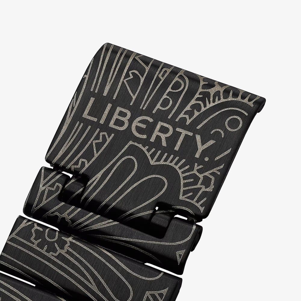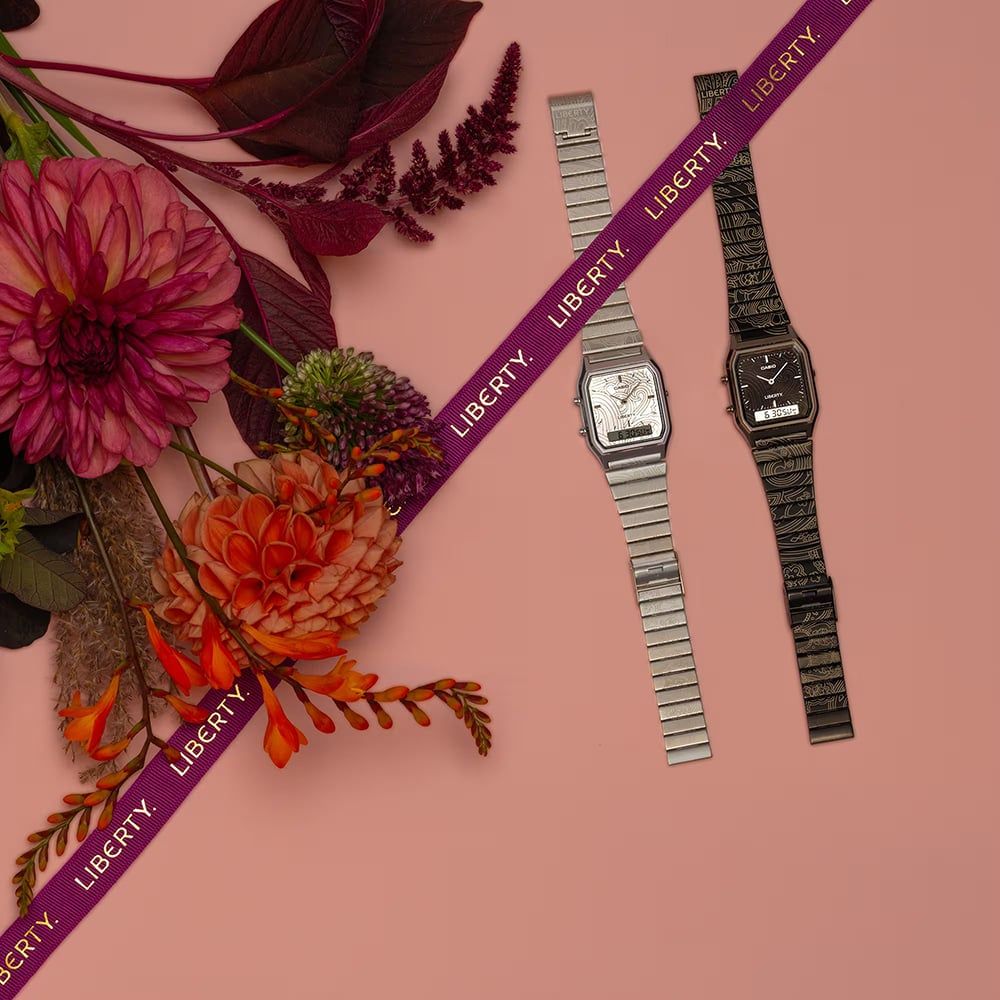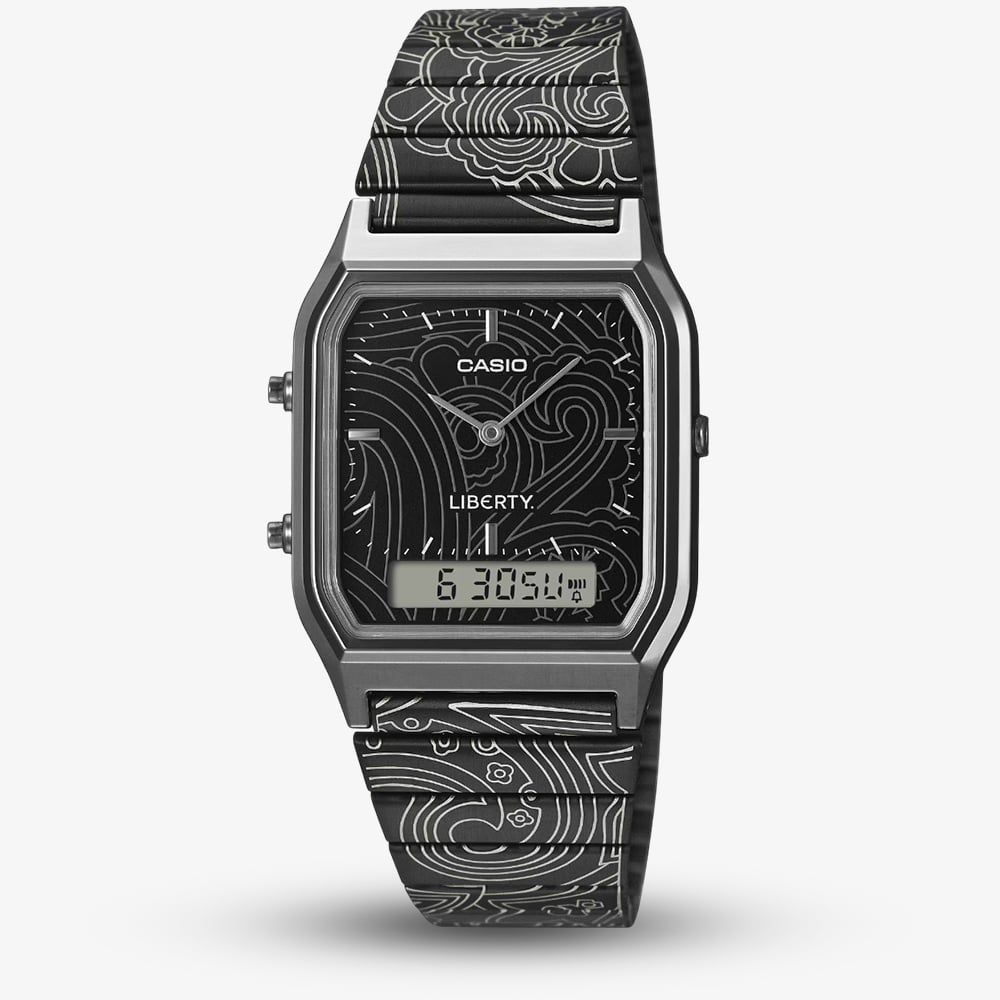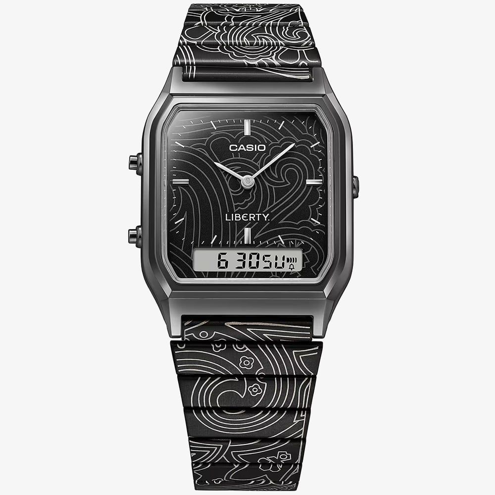 The Casio AQ-230EBLT-1AER blends vintage charm with the artistry of Liberty London, bringing a soft decorative richness to a much-loved classic. The watch retains its crisp angular case and clear analogue digital display, now complemented by a paisley motif inspired by Liberty’s Fanfare design. This pattern is finely laser engraved across the dial and bracelet, creating a delicate ripple of texture that catches the light with understated elegance.