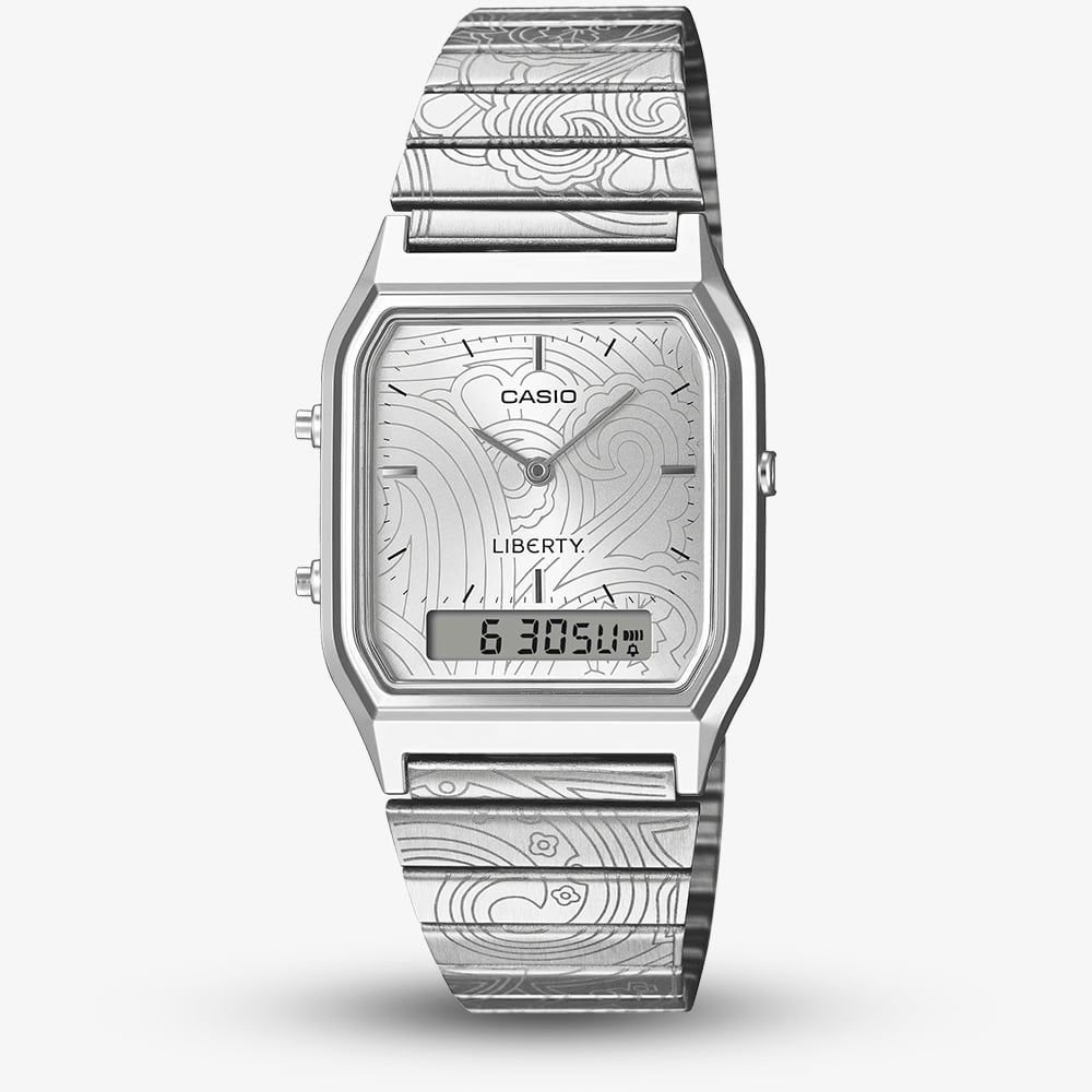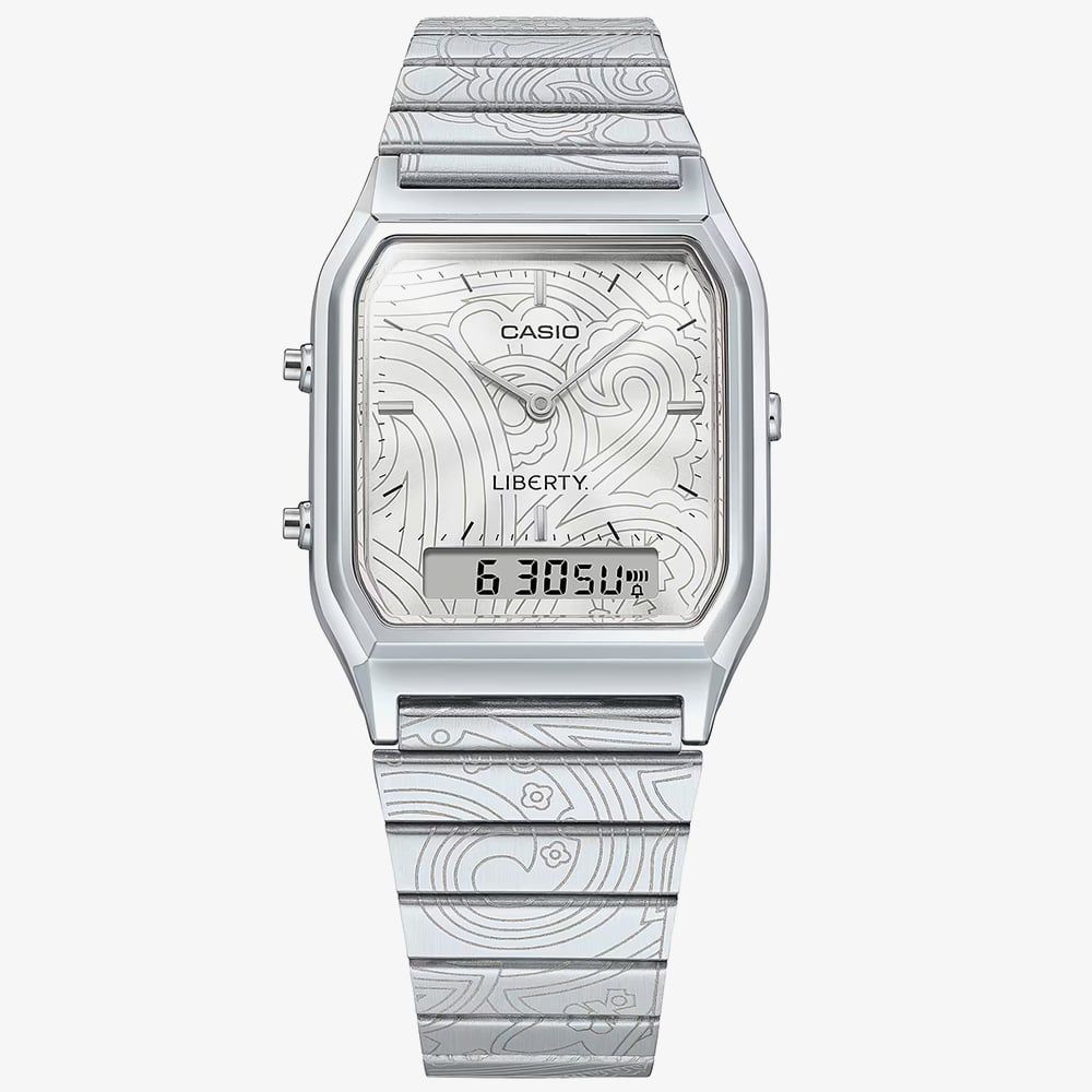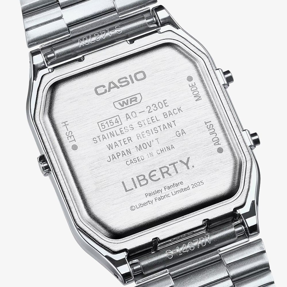 The Casio AQ-230ELT-7AER blends vintage charm with the artistry of Liberty London, bringing a soft decorative richness to a much-loved classic. The watch retains its crisp angular case and clear analogue digital display, now complemented by a paisley motif inspired by Liberty’s Fanfare design. This pattern is finely laser engraved across the dial and bracelet, creating a delicate ripple of texture that catches the light with understated elegance.