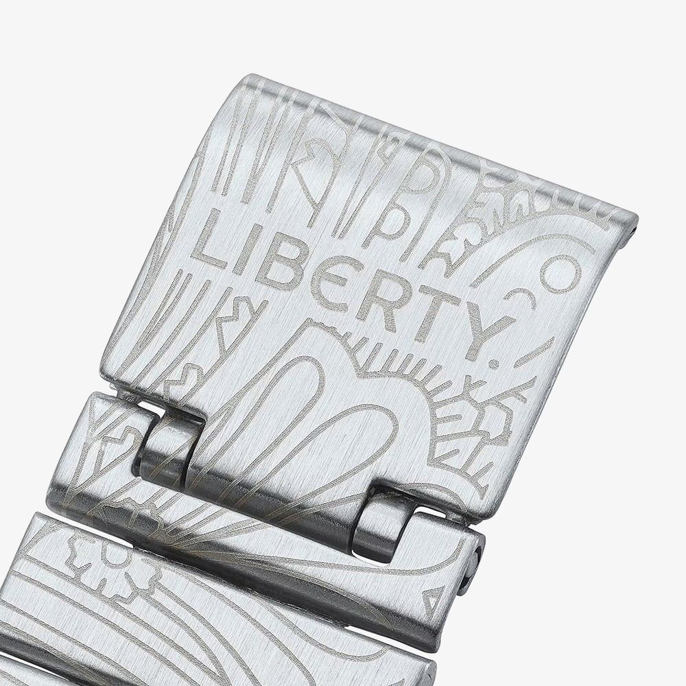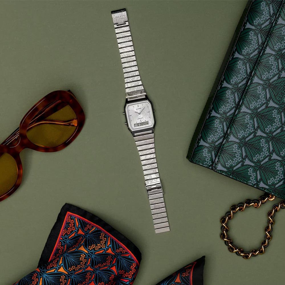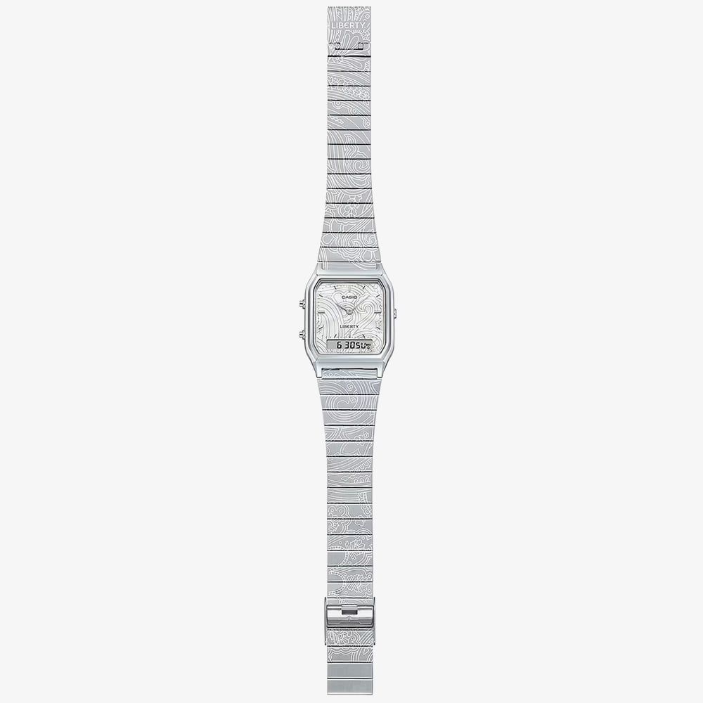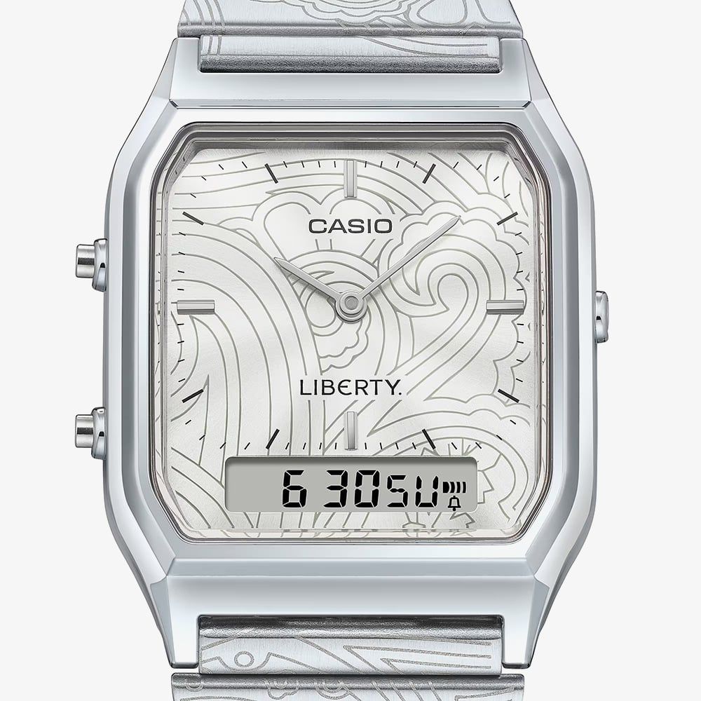 The Casio AQ-230ELT-7AER blends vintage charm with the artistry of Liberty London, bringing a soft decorative richness to a much-loved classic. The watch retains its crisp angular case and clear analogue digital display, now complemented by a paisley motif inspired by Liberty’s Fanfare design. This pattern is finely laser engraved across the dial and bracelet, creating a delicate ripple of texture that catches the light with understated elegance.