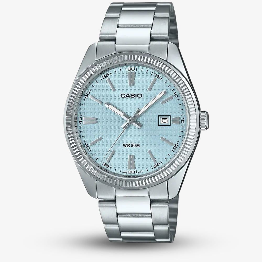 This refined timepiece features a deep blue dial set within a polished stainless steel case and bracelet, offering a timeless look that transitions effortlessly from work to weekend. The minimalist dial is accented with silver-tone hour markers and hands, along with a date display at 3 o’clock for added practicality. Protected by a durable mineral crystal glass, the watch combines understated style with daily functionality. Powered by a precise quartz movement and water resistant up to 50 metres, this watch is built to keep up with your schedule while adding a touch of sophistication to any outfit.