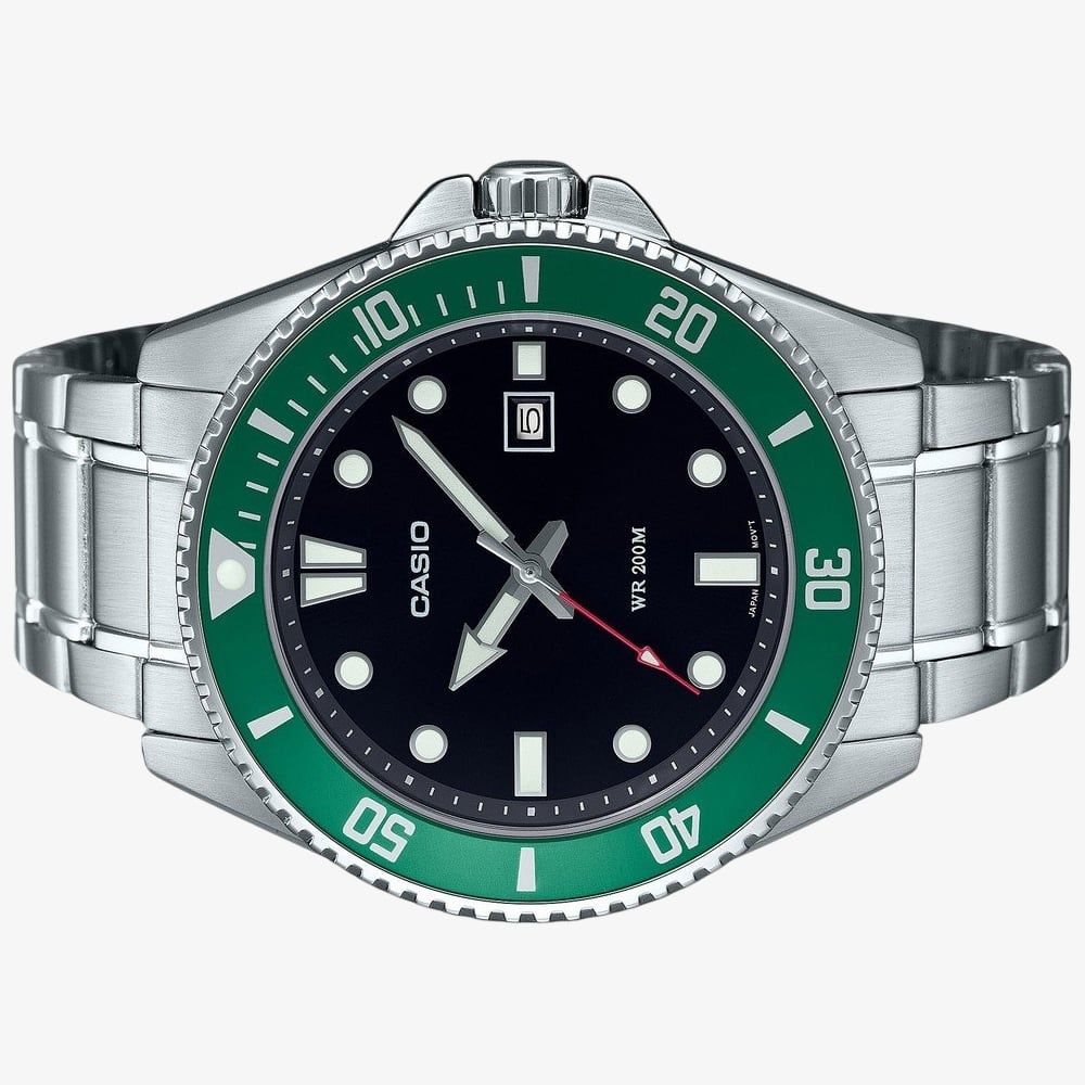 A robust and stylish timepiece, designed for adventure seekers. Featuring a striking green bezel and a durable stainless steel case, this watch delivers a bold, contemporary look while maintaining superior functionality. This watch boasts an impressive 200-meter water resistance, making it ideal for both indoor and outdoor activities. The unidirectional rotating bezel enhances practicality, while luminous hands and markers ensure excellent readability in low-light conditions. A reliable quartz movement powers the watch, ensuring precise timekeeping. The stainless steel bracelet provides a comfortable and secure fit, while the date display adds a practical touch to the design.