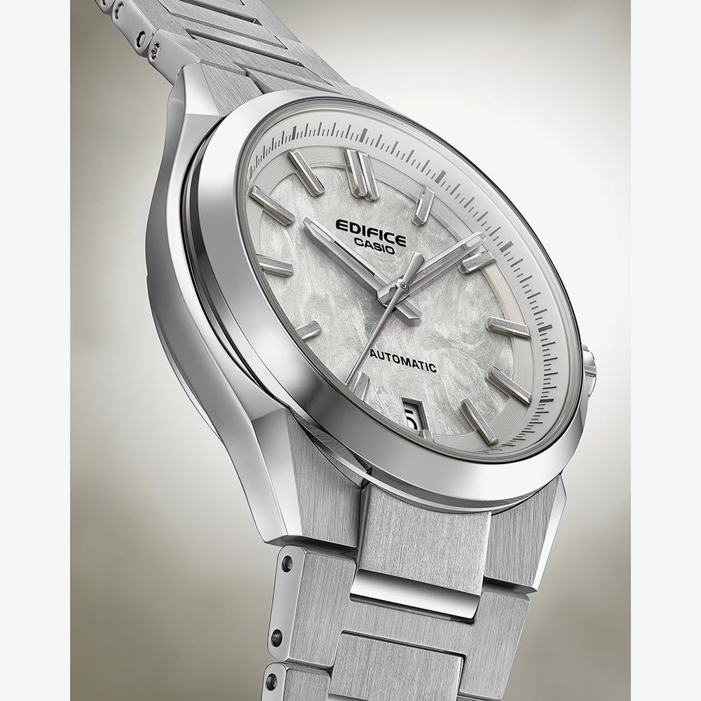 Encased in polished stainless steel, this three-hand automatic timepiece features a sapphire crystal for exceptional clarity and durability. The raised indexes and sharply contoured bezel add a sense of motion and depth, while the transparent case back reveals the 40-hour mechanical movement in action, a subtle nod to the engineering beauty beneath the surface. At 39mm, the case offers a comfortable, versatile fit, complemented by 100-metre water resistance for everyday confidence. The Casio Edifice EFK-100D-7A is a modern classic for those who admire the rhythm of precision and performance.