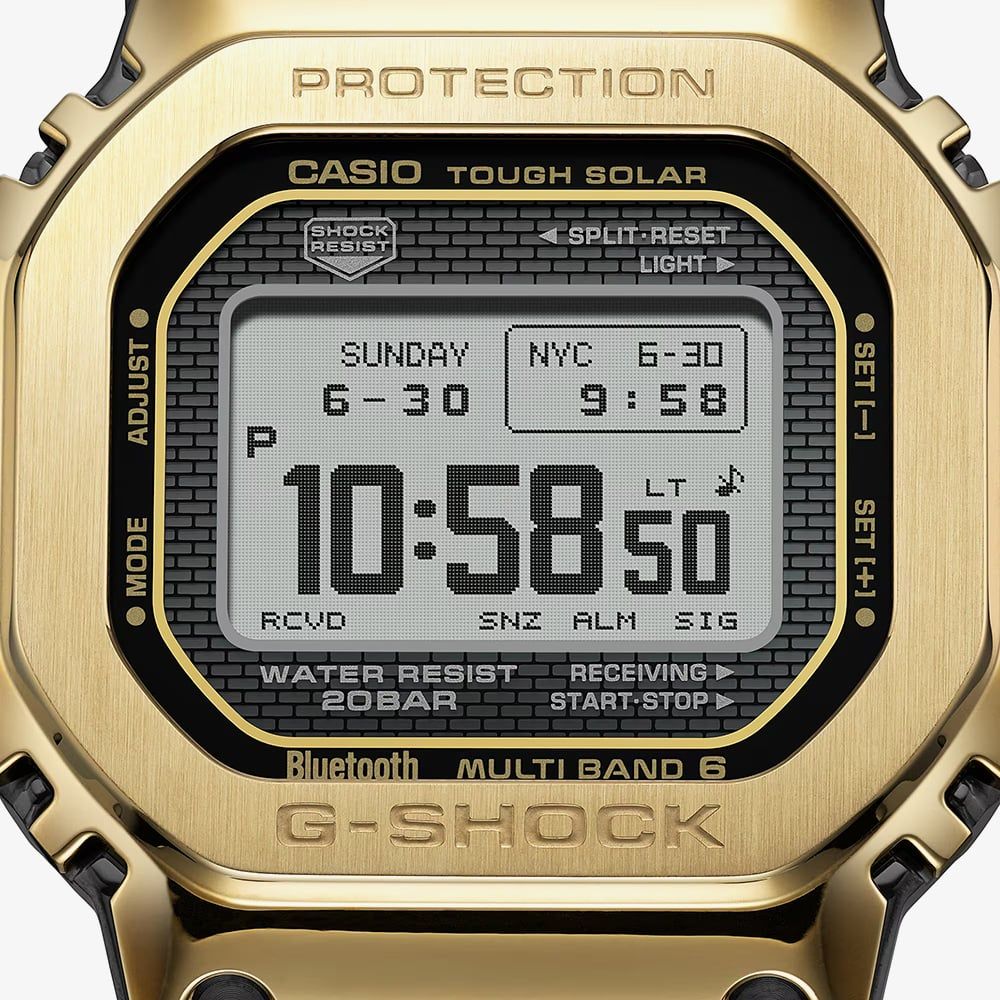 Experience premium durability with this GMW-BZ5000GD-9ER gold plated stainless steel G-Shock Full Metal Origin. Its full-metal case is reinforced with an internal resin shock absorber, highlighted by the watch’s intricate side profile. Equipped with Tough Solar power, a clear LCD digital display, Bluetooth smartphone pairing, and 2 World Time modes covering 38 time zones, it offers strength, smart connectivity, and global convenience in one iconic design.