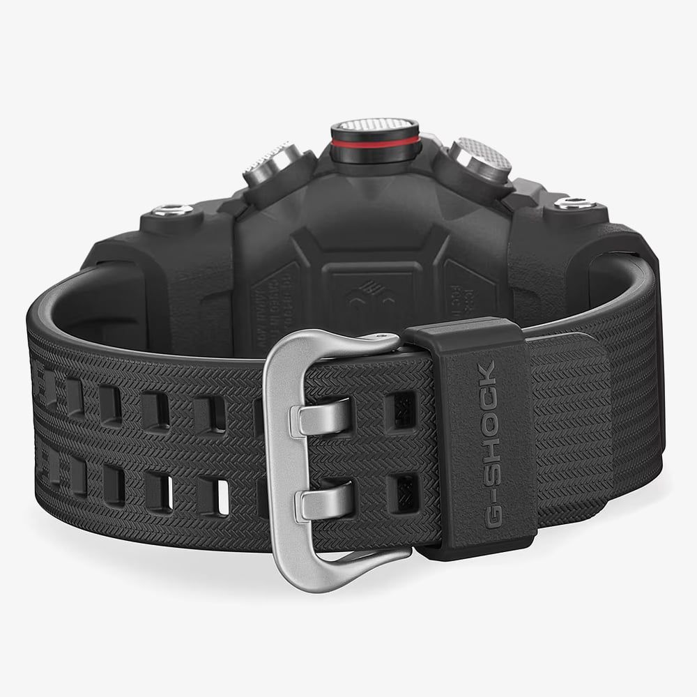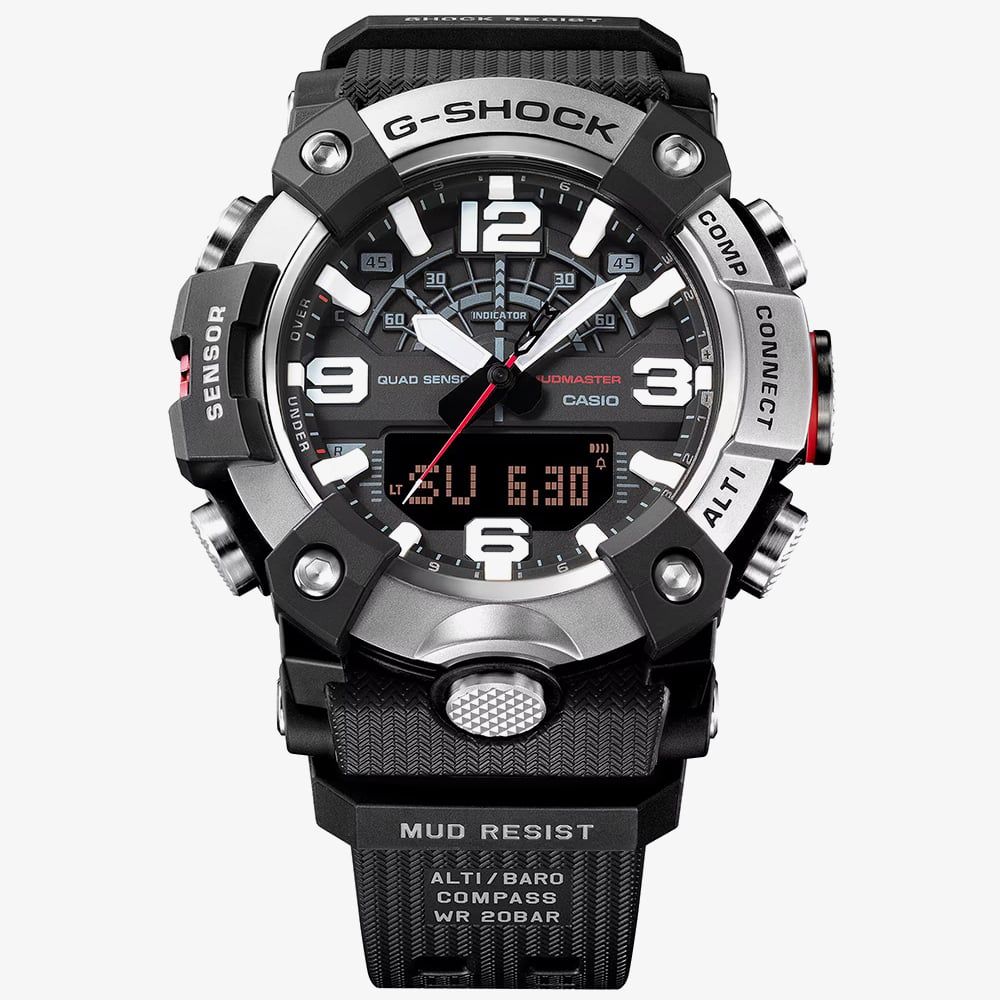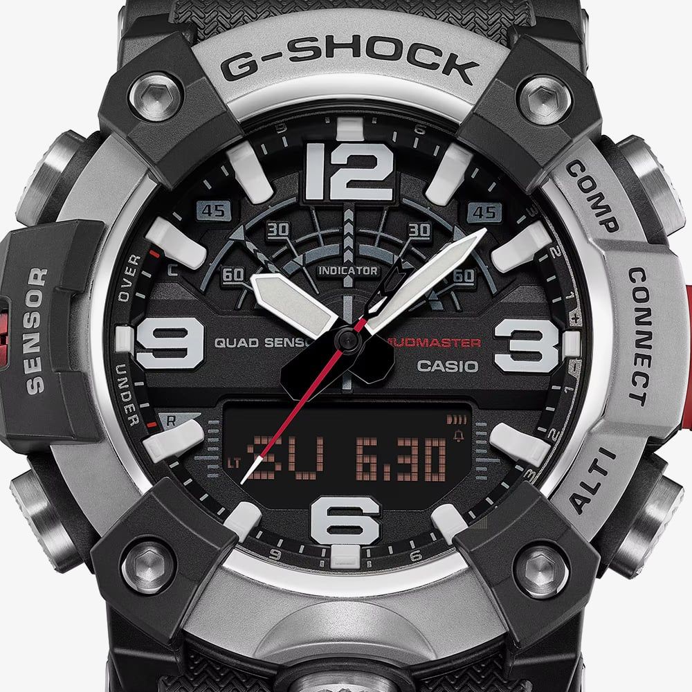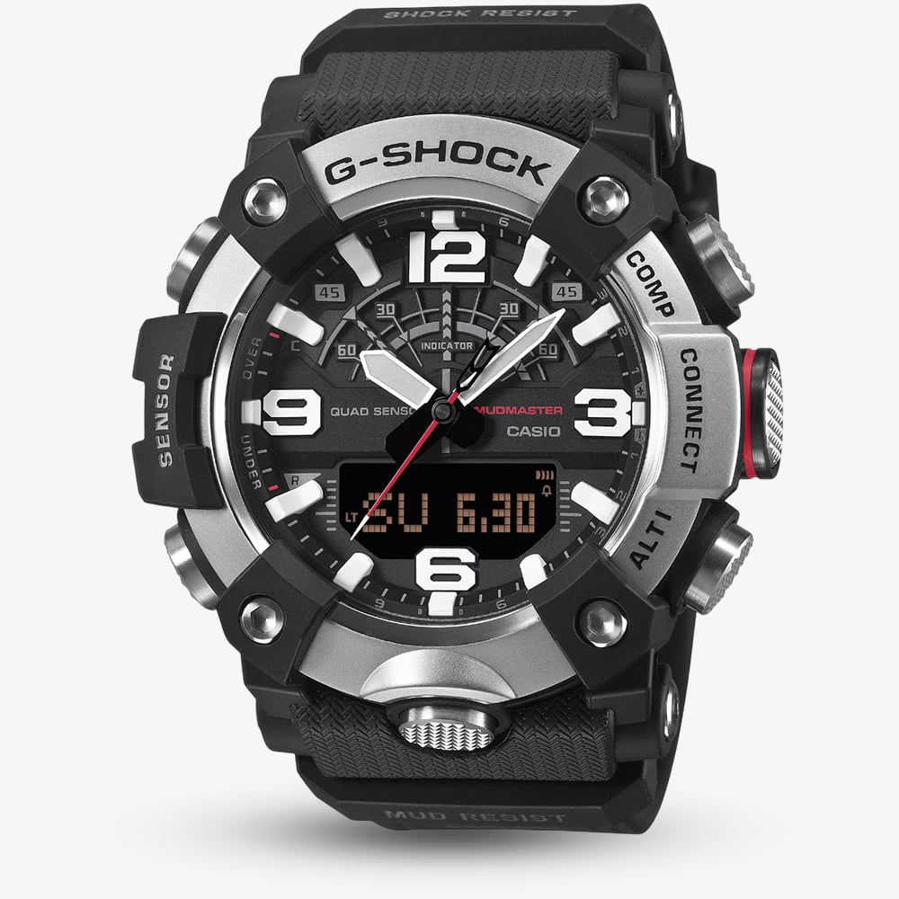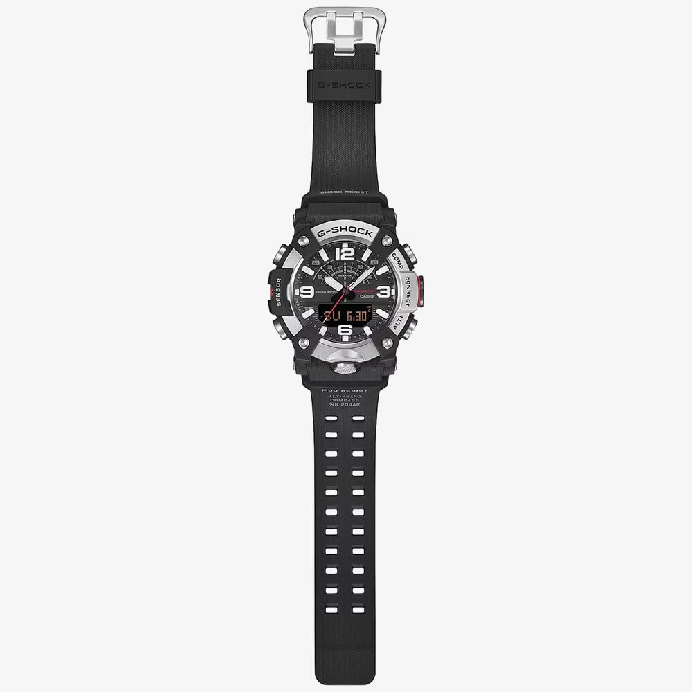 The GG-B100XM-1AER is a Master of G Mudmaster designed for those who navigate the world’s most demanding environments. This formidable timepiece features a silvery stainless steel bezel with a honed, matte finish, specifically chosen to reduce reflections and resist the ingress of mud and dust. The high-rigidity carbon case provides exceptional airtightness and shock resistance, ensuring the internal Quad Sensor remains protected against the elements. Its robust black resin strap is crafted for durability, making it an essential tool for professionals and explorers alike.