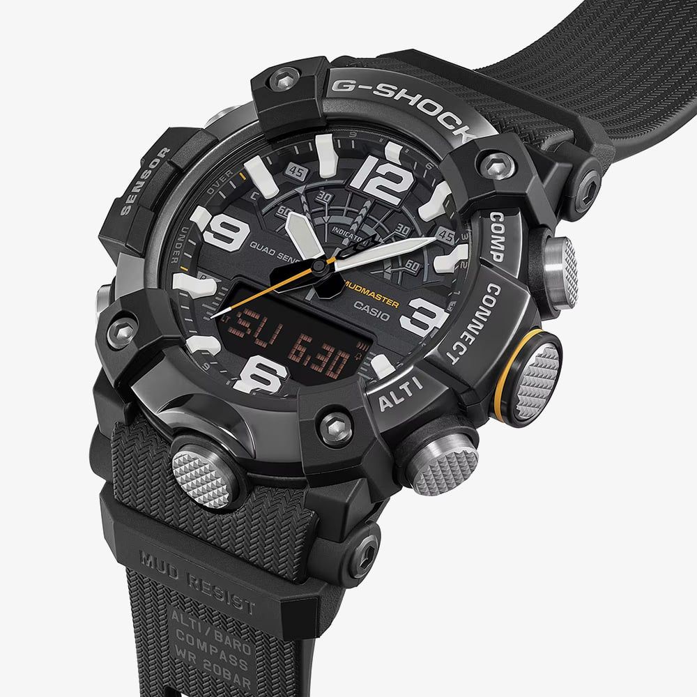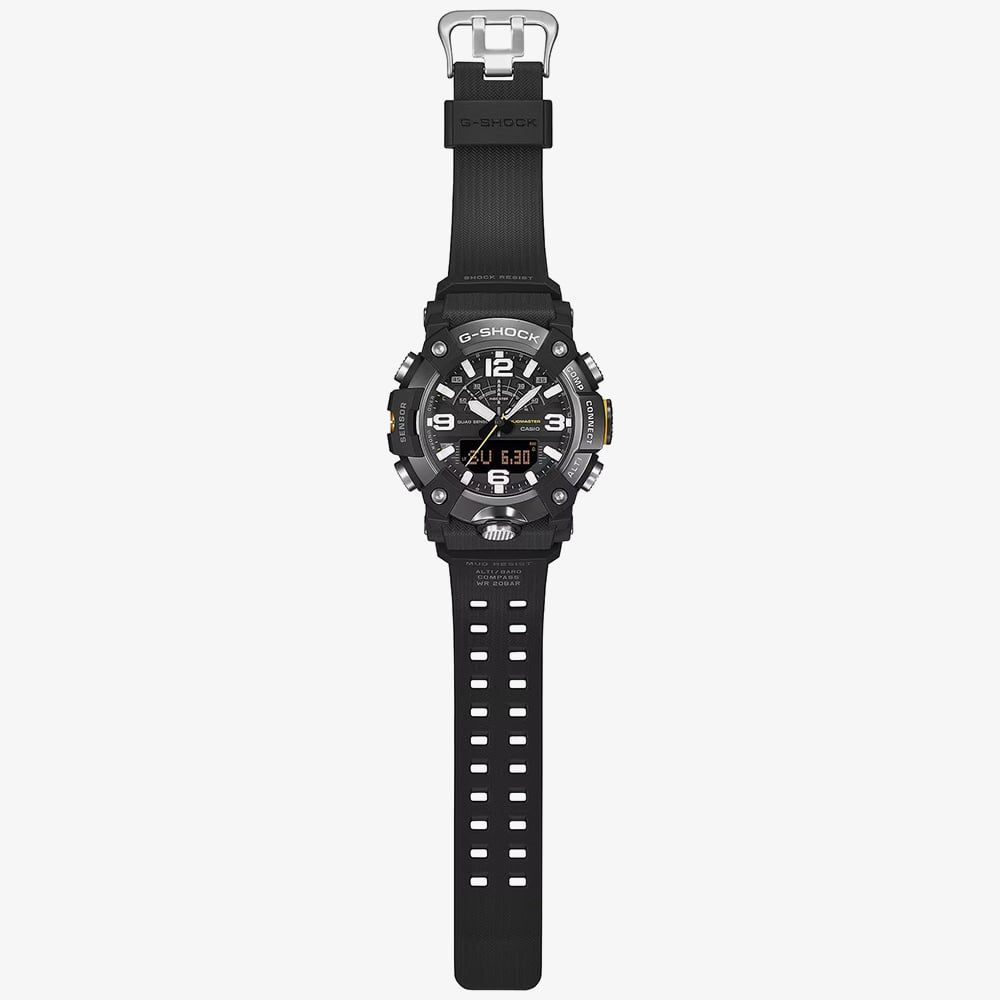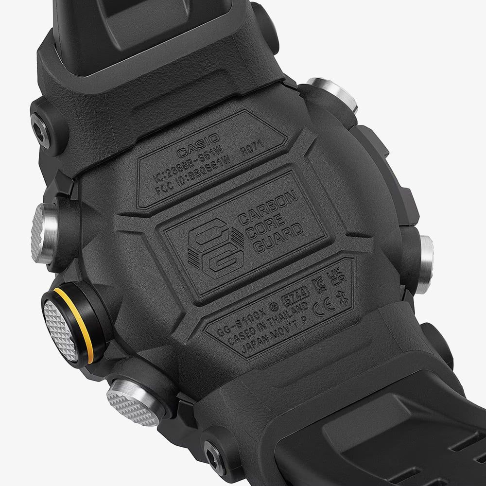 Commanding and resilient, the GG-B100XMB-1AER Mudmaster stands as a pinnacle of professional timekeeping. This model is distinguished by its black ion-plated stainless steel bezel, finished with a mirror sheen that provides a refined, metallic contrast to the tactical black case. Engineered to thrive in mud and debris, the watch features a carbon-reinforced structure and a glass-fibre reinforced back cover, offering unparalleled durability without excessive weight. It is a timepiece for the bold, designed to withstand the harshest land missions while maintaining a sophisticated presence.