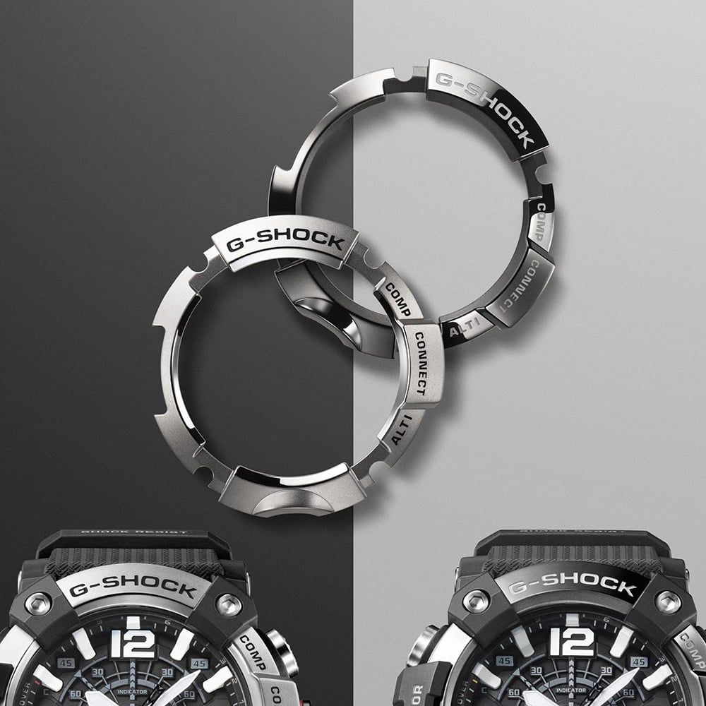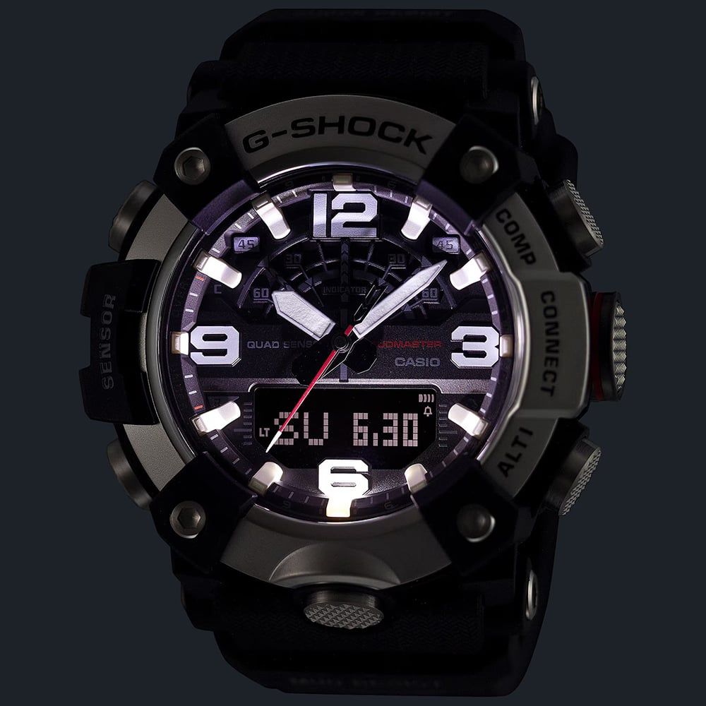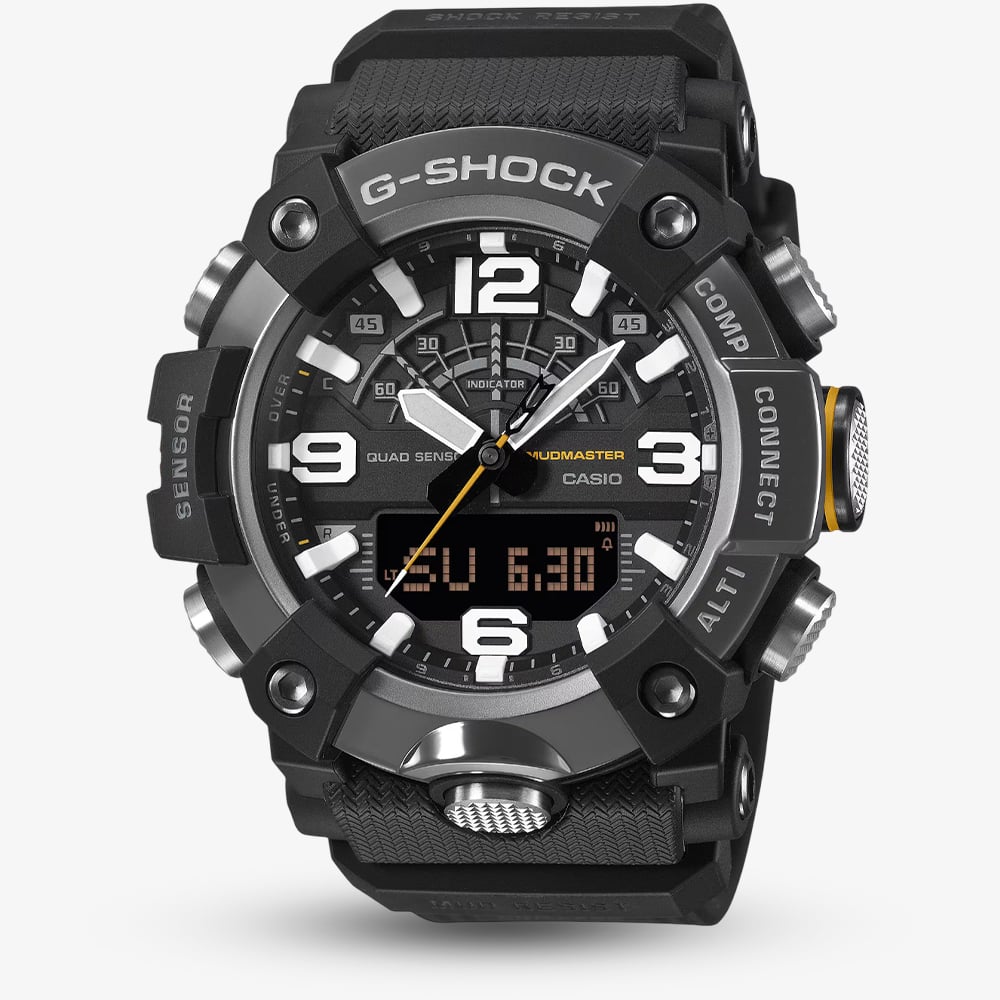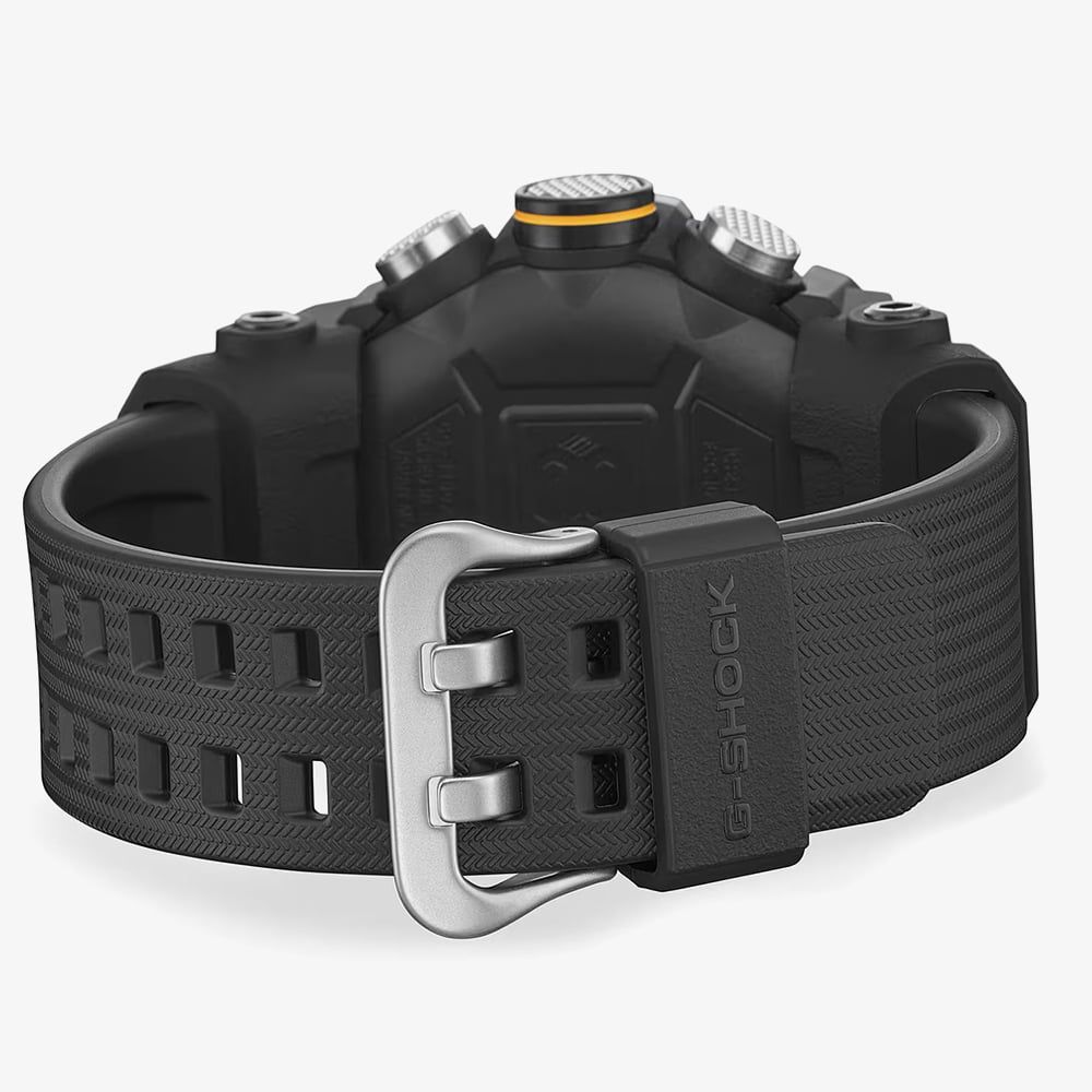 Commanding and resilient, the GG-B100XMB-1AER Mudmaster stands as a pinnacle of professional timekeeping. This model is distinguished by its black ion-plated stainless steel bezel, finished with a mirror sheen that provides a refined, metallic contrast to the tactical black case. Engineered to thrive in mud and debris, the watch features a carbon-reinforced structure and a glass-fibre reinforced back cover, offering unparalleled durability without excessive weight. It is a timepiece for the bold, designed to withstand the harshest land missions while maintaining a sophisticated presence.