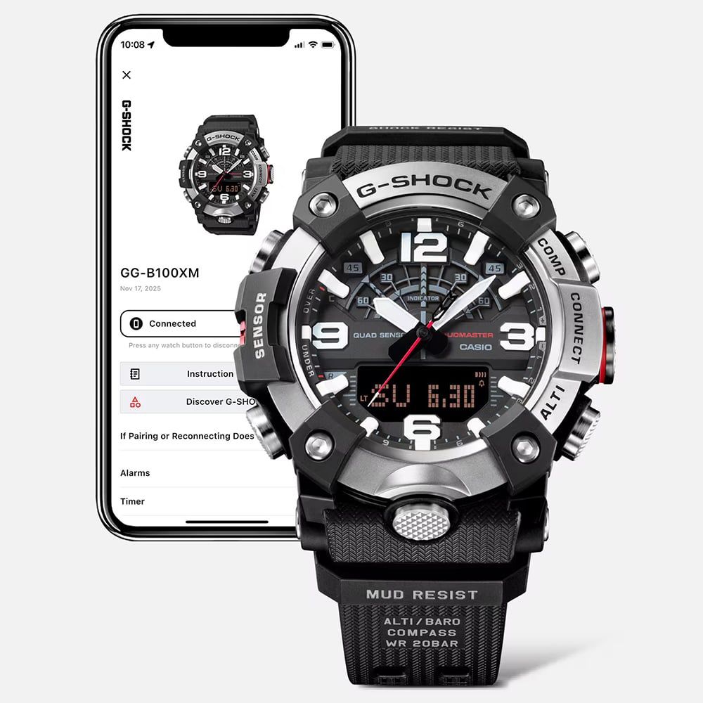 • 200 metre water resistance.Casiohttps://www.thbaker.co.uk/media/catalog/product/2/1/21-43-25150594_casio_02.jpghttps://www.thbaker.co.uk/media/catalog/product/2/1/21-43-25150594_casio_03.jpghttps://www.thbaker.co.uk/media/catalog/product/2/1/21-43-25150594_casio_04.jpghttps://www.thbaker.co.uk/media/catalog/product/2/1/21-43-25150594_casio_05.jpghttps://www.thbaker.co.uk/media/catalog/product/2/1/21-43-25150594_casio_06.jpghttps://www.thbaker.co.uk/media/catalog/product/2/1/21-43-25150594_casio_07.jpghttps://www.thbaker.co.uk/media/catalog/product/2/1/21-43-25150594_casio_08.jpghttps://www.thbaker.co.uk/media/catalog/product/2/1/21-43-25150594_casio_09.jpghttps://www.thbaker.co.uk/media/catalog/product/2/1/21-43-25150594_casio_10.jpghttps://www.thbaker.co.uk/media/catalog/product/2/1/21-43-25150594_casio_11.jpghttps://www.thbaker.co.uk/media/catalog/product/2/1/21-43-25150594_casio_12.jpghttps://www.thbaker.co.uk/media/catalog/product/2/1/21-43-25150594_casio_model_01.jpghttps://www.thbaker.co.uk/media/catalog/product/2/1/21-43-25150594_casio_model_02.jpghttps://www.thbaker.co.uk/media/catalog/product/2/1/21-43-25150594_casio_model_03.jpghttps://www.thbaker.co.uk/media/catalog/product/2/1/21-43-25150594_casio_model_04.jpg4549526409936add-to-cartcondition:Nodisc_no_stock:Noex_display:Nosearch_keywords:WaterproofNoNoNoWaterproof214325150594CasioGG-B100XMB-1AERMensOfficial Casio Packaging2 Year Casio WarrantySmartwatchNoWatchBio-Sourced Plastic StrapBlack19.4mmBio-Sourced PlasticRound51.3mmPin BuckleBlackBlackMineral Crystal GlassDual DisplayNo StoneNo Stone104.0gYesYesYesNoYesYesNo200 metresQuartziPhone & Android{"name":"Klarna","text":"3 payments of \u00a3123","imageUrl":"https:\/\/www.thbaker.co.uk\/media\/nosto\/klarna.png"}Casio Mens G-Shock Mudmaster Black Strap Smart Watch21-43-251505942026-03-24 00:00:000[{"path":"\/Watches","url":"\/watches\/"},{"path":"\/Watches\/Mens Watches","url":"\/mens-watches\/"},{"path":"\/Seasonal\/Christmas Collection","url":"\/christmas-collection\/"},{"path":"\/Seasonal\/Christmas Collection\/Gifts For Him","url":"\/christmas-gifts-for-him\/"},{"path":"\/Watches\/Chronograph Watches","url":"\/chronograph-watches\/"},{"path":"\/Brands A-Z\/Casio ","url":"\/casio-watches\/"},{"path":"\/Brands A-Z\/Casio \/Casio Mens ","url":"\/casio-gents-watches\/"},{"path":"\/Watches\/Digital Watches","url":"\/digital-watches\/"},{"path":"\/Brands A-Z\/Casio \/Casio G-Shock ","url":"\/casio-g-shock\/"},{"path":"\/Watches\/Divers Watches","url":"\/divers-watches\/"},{"path":"\/Watches\/Quartz Watches","url":"\/quartz-watches\/"},{"path":"\/Watches\/Fashion Watches","url":"\/fashion-watches\/"},{"path":"\/Watches\/Smart Watches","url":"\/smart-watches\/"},{"path":"\/Brands A-Z\/Casio \/Casio G-Shock \/G Shock Mud Master","url":"\/g-shock-mud-master-watches\/"},{"path":"\/Brands A-Z\/Casio \/Casio Chronograph","url":"\/casio-chronograph\/"},{"path":"\/Watches\/Smart Watches\/Step Tracking","url":"\/step-tracking-smartwatches\/"},{"path":"\/Watches\/Smart Watches\/Waterproof Smart Watches","url":"\/waterproof-smartwatches\/"},{"path":"\/Seasonal\/Christmas Collection\/Christmas Watches","url":"\/christmas-watches\/"},{"path":"\/Free Gift With Purchase Products","url":"\/free-gift-with-purchase-products\/"},{"path":"\/THB-1888-Casio-Ranges\/THB-1888-Casio-Internet","url":"\/thb-1888-casio-internet\/"},{"path":"\/Free Gift","url":"\/free-gift\/"},{"path":"\/Watches\/Waterproof Watches","url":"\/waterproof-watches\/"},{"path":"\/Watches\/Japanese Watches","url":"\/japanese-watches\/"},{"path":"\/\u00a330 Gift Card (\u00a3300-\u00a3499.99)","url":"\/30-gift-card-300-499-99\/"},{"path":"\/Brands A-Z\/Casio \/Casio Latest Launches","url":"\/casio-latest-launches\/"}]2026-03-24