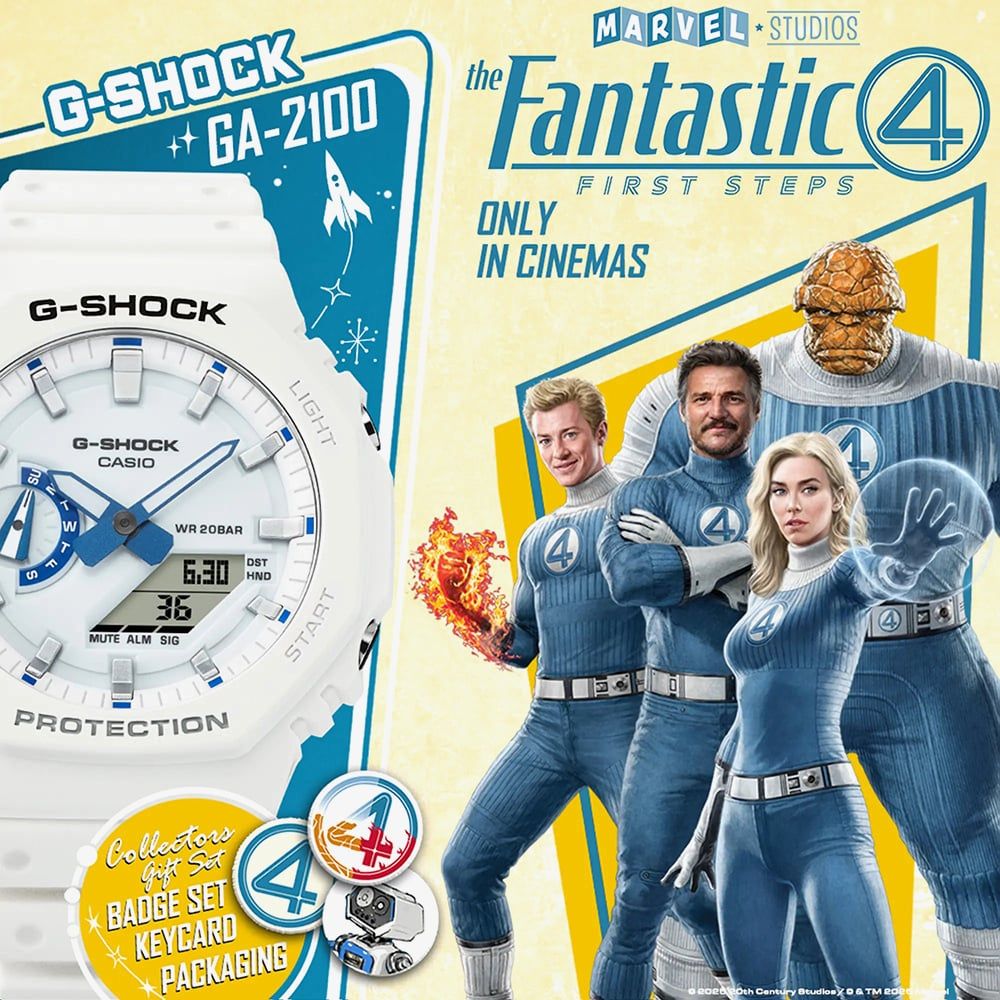 LAUNCH INTO HERO MODE: G-SHOCK x Marvel Studios’ The Fantastic Four: First Steps – A Limited Collector’s Edition Built for Adventure. Inspired by Marvel’s original super-team, this four-watch set features bold white-and-blue designs that echo the iconic suits of the Fantastic Four.