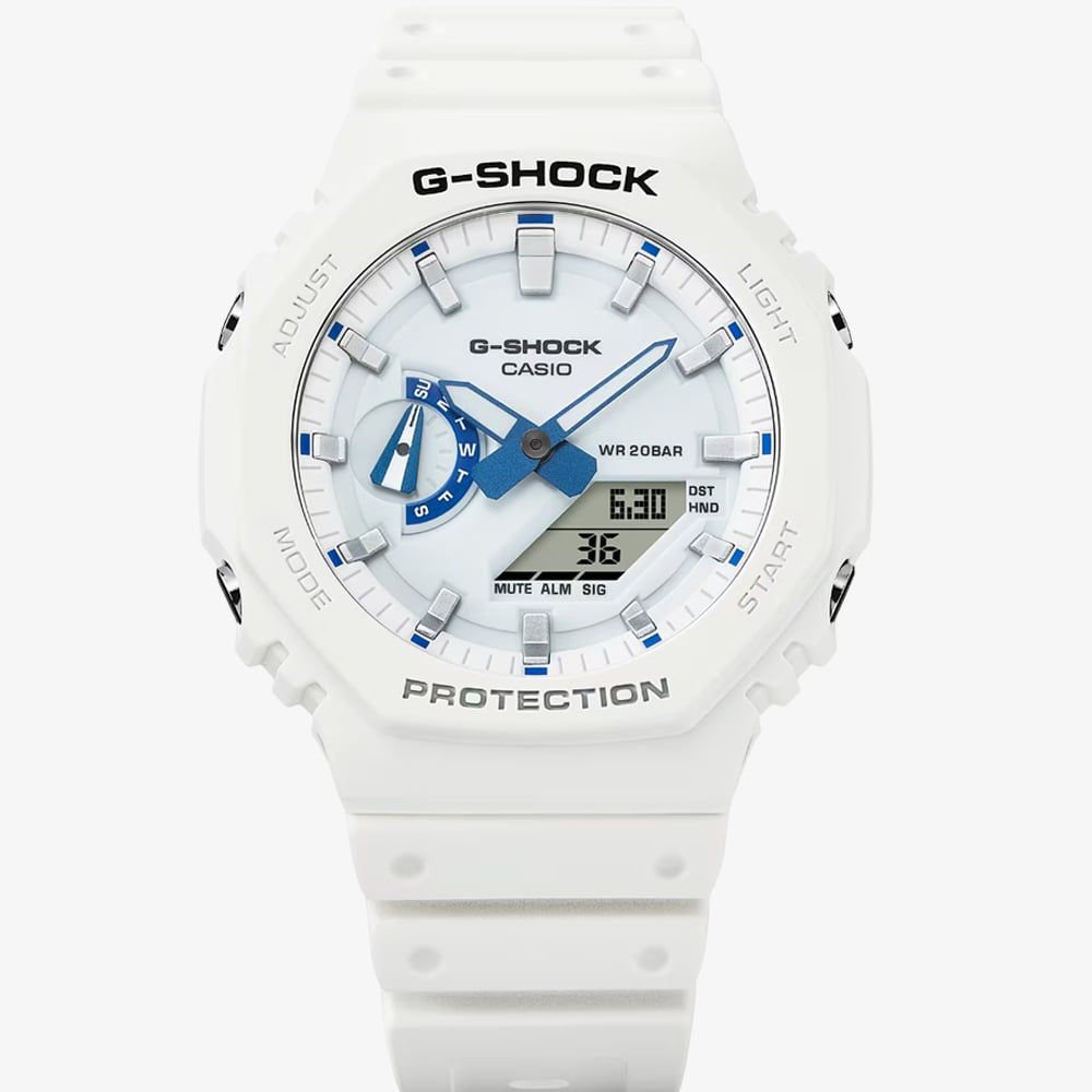 Featuring a sleek white resin case and strap, this model is elevated by a striking blue-accented dial, delivering a clean yet eye-catching look perfect for both casual and sporty wear. This watch is shock-resistant and water-resistant up to 200 metres, ensuring it stands up to life’s toughest challenges. The dual analogue-digital display offers quick access to essential functions like world time, stopwatch, countdown timer, and daily alarms.