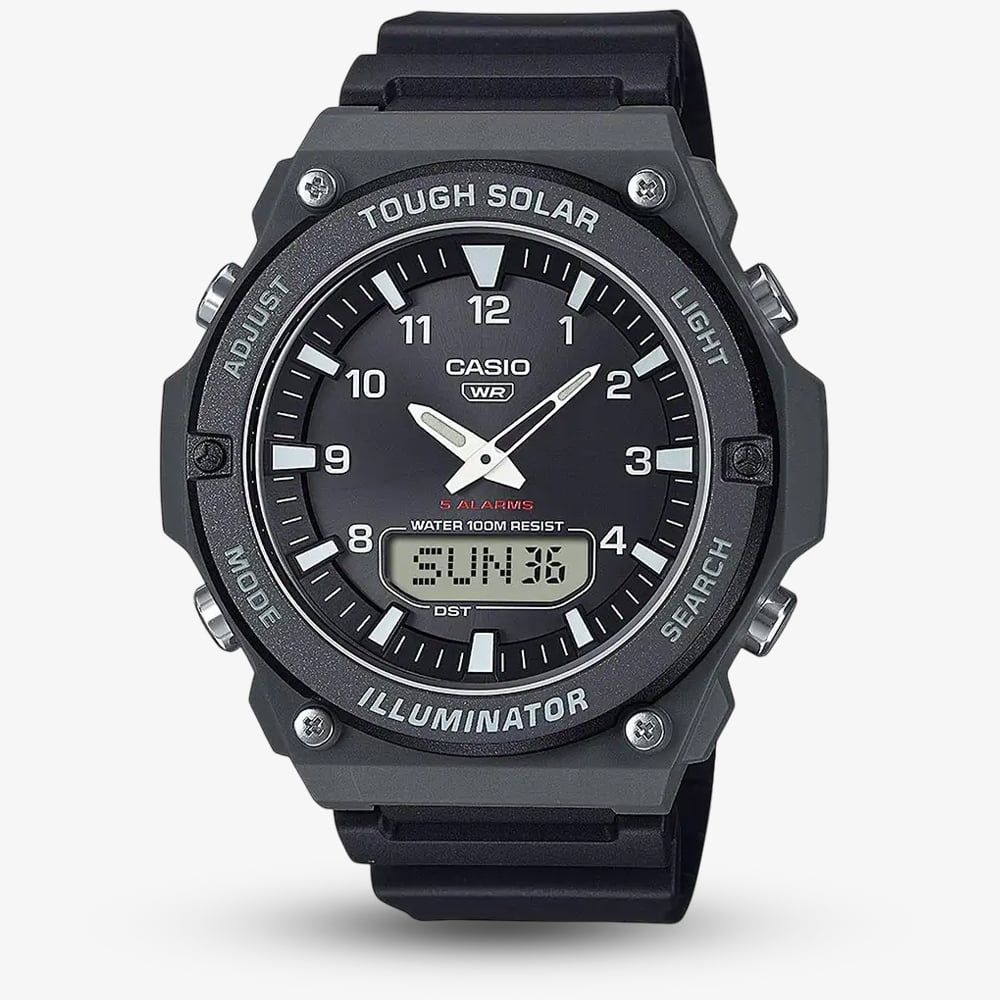 A sleek, solar-powered watch built for active lifestyles. Combining practicality with rugged design, this versatile timepiece is ideal for those who demand reliability without sacrificing style. The watch features a bold black plastic case and strap, offering lightweight comfort and long-lasting durability. Its dual display combines analogue hands with a digital screen, giving you the best of both worlds in a single, easy-to-read format. Thanks to Casio's Tough Solar technology, the watch charges itself from natural or artificial light, eliminating the need for battery changes. Packed with useful features including world time, a 1/100-second stopwatch, countdown timer, 5 daily alarms, and an automatic calendar, this watch is ready for any challenge.