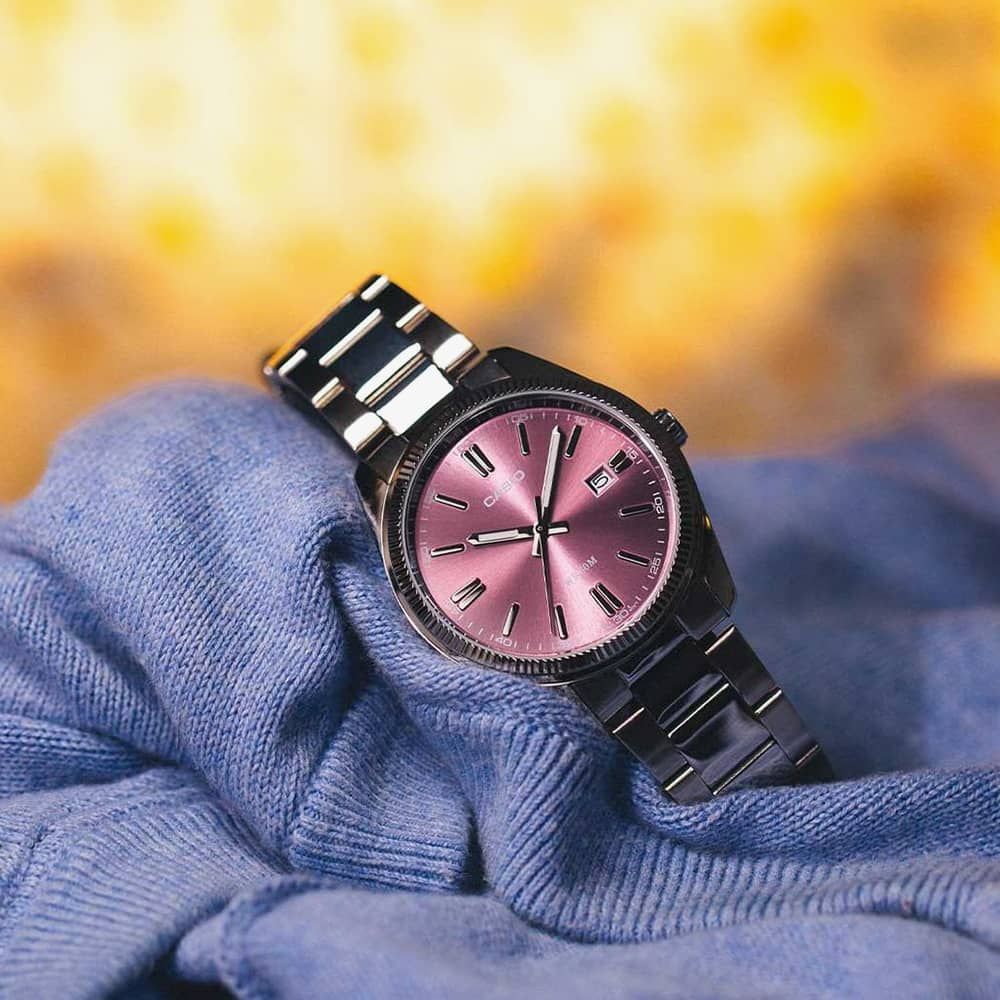 A stainless-steel watch featuring a striking purple dial exudes a bold and contemporary style. With its sleek stainless-steel construction, this timepiece offers durability and sophistication. The deep purple dial adds a pop of colour and personality to the watch, making it a standout accessory for any outfit or occasion.