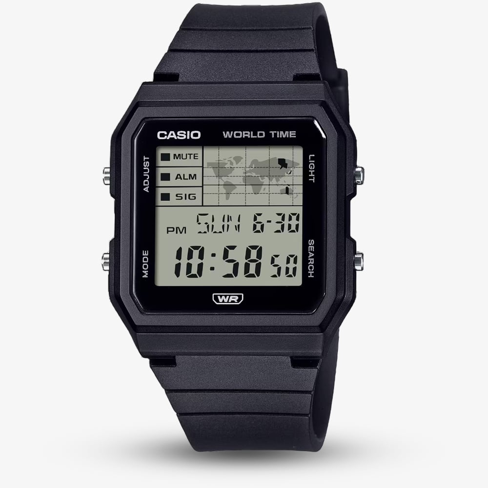 This watch combines Casio's renowned durability with innovative features, making it an essential companion for everyday adventures. Featuring a distinctive square design with a black resin case and strap, this watch offers a bold and contemporary look. The digital display showcases not only the time but also includes a world map function, perfect for travellers who want quick access to global time zones.