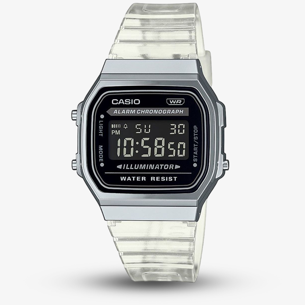 A contemporary twist on a classic design, offering a sleek and modern look with versatile appeal. Featuring a clear plastic strap, this watch stands out with its unique and trendy aesthetic, perfect for adding a fresh edge to any outfit. The digital display is housed in a polished square case, providing essential functions such as a stopwatch, alarm, and day-date calendar, ensuring practicality alongside style. Its reliable quartz movement guarantees accurate timekeeping, while the watch’s lightweight design ensures comfortable wear throughout the day.