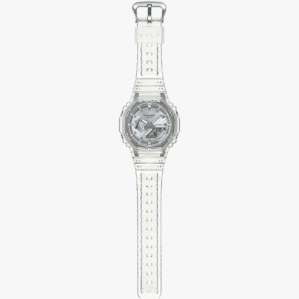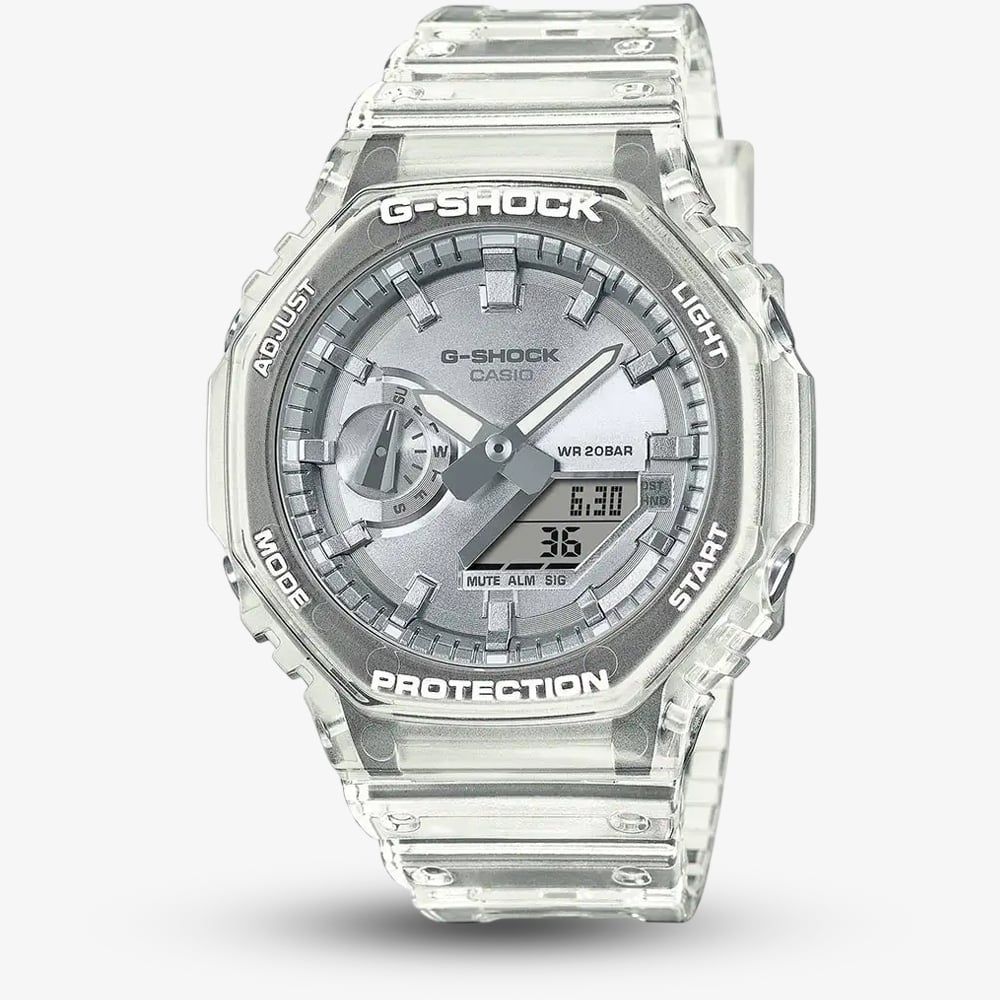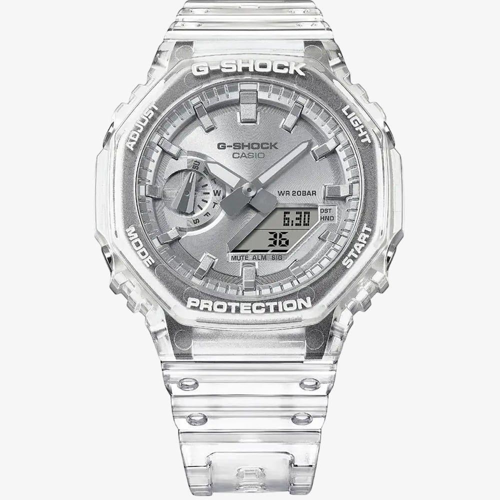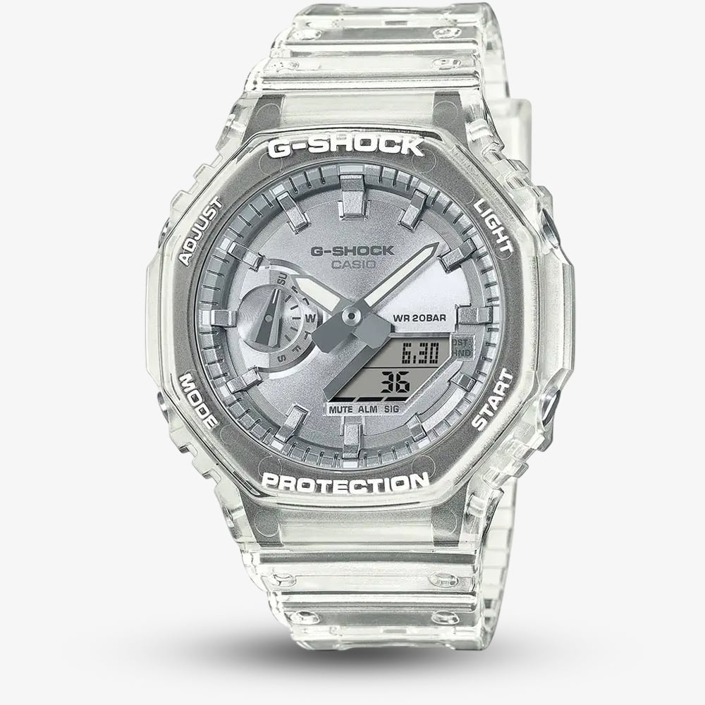 Refined yet rugged, this watch is a bold fusion of futuristic design and legendary durability. With its eye-catching silver-tone dial encased in a semi-transparent resin case and strap, this unisex timepiece brings a sleek, modern aesthetic to the iconic G-Shock design. Equipped with enhanced shock resistance and water resistance of up to 200 metres, this watch is built to handle whatever life throws at it — from urban commutes to outdoor adventures. The dual analogue-digital display offers practical functionality, including world time, stopwatch, countdown timer, daily alarms, and automatic calendar. Its slim, lightweight profile ensures all-day comfort, while the detailing adds a touch of futuristic elegance.