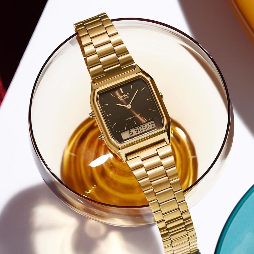 A sophisticated timepiece that artfully blends vintage charm with modern functionality. This dual-display watch combines an analogue clock face with a digital screen, making it a practical yet stylish accessory for any occasion. Key features include both analogue hands and a digital display for added convenience and versatility. A rectangular gold-tone stainless steel case and matching bracelet exude timeless sophistication, complemented by a brown dial. With a slim and lightweight profile, it fits comfortably on the wrist, ideal for everyday wear. Its gold-tone finish and versatile features make it a standout choice for casual and formal settings alike.