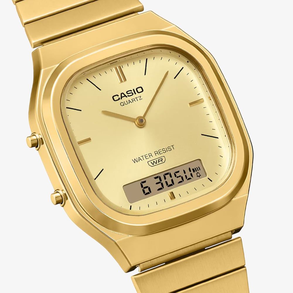 Bringing a touch of retro charm to your collection, designed for both men and women. This unisex timepiece embodies Casio’s reputation for reliability and everyday practicality. This watch showcases a sleek rectangular gold-tone case and an iconic vintage digital-analogue display, blending classic 1980s style with modern convenience. The matching gold dial adds a subtle pop of colour and a touch of luxury. Its compact, lightweight resin case and adjustable stainless steel bracelet ensure all-day comfort and a perfect fit.
