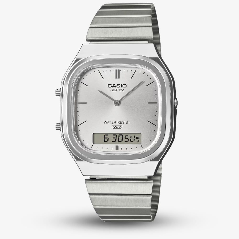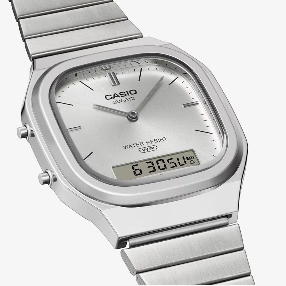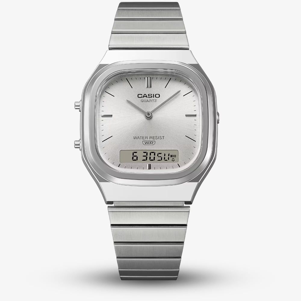 This watch features a sleek silver-tone stainless steel bracelet and a compact rectangular case that embodies Casio’s signature retro aesthetic. Its clean silver dial and dual analogue-digital display create a timeless, versatile look that suits both men and women. Lightweight and comfortable, it’s ideal for everyday wear — whether at work or out for the evening.