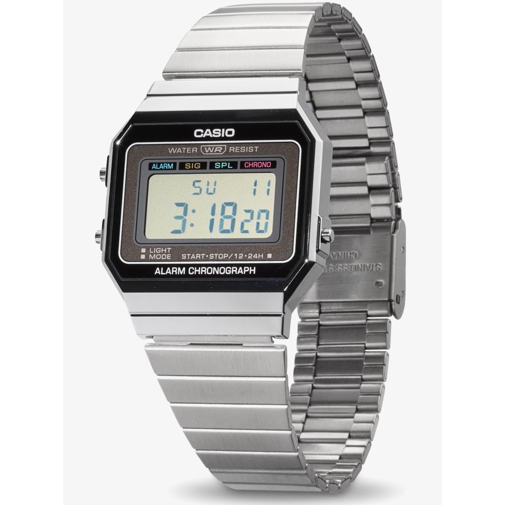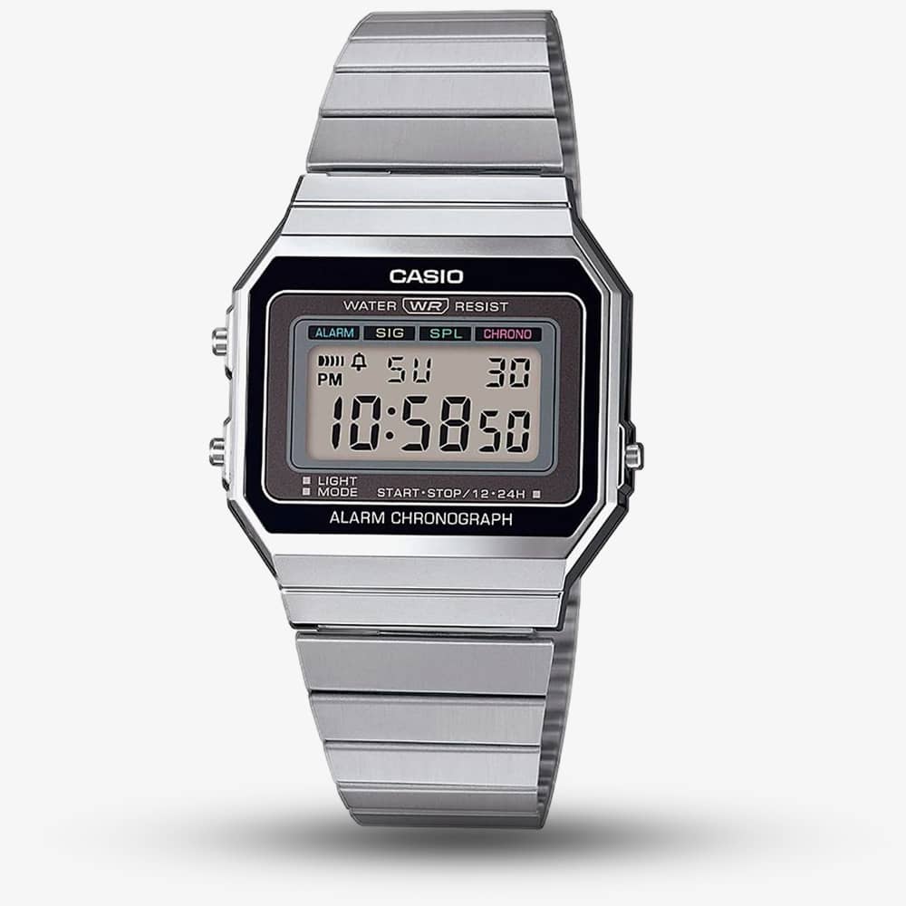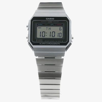 This digital day/ date display watch from Casio has a vintage look whilst also featuring an alarm, light and countdown timer function. It is completed with a stainless steel bracelet and a fold over clasp.