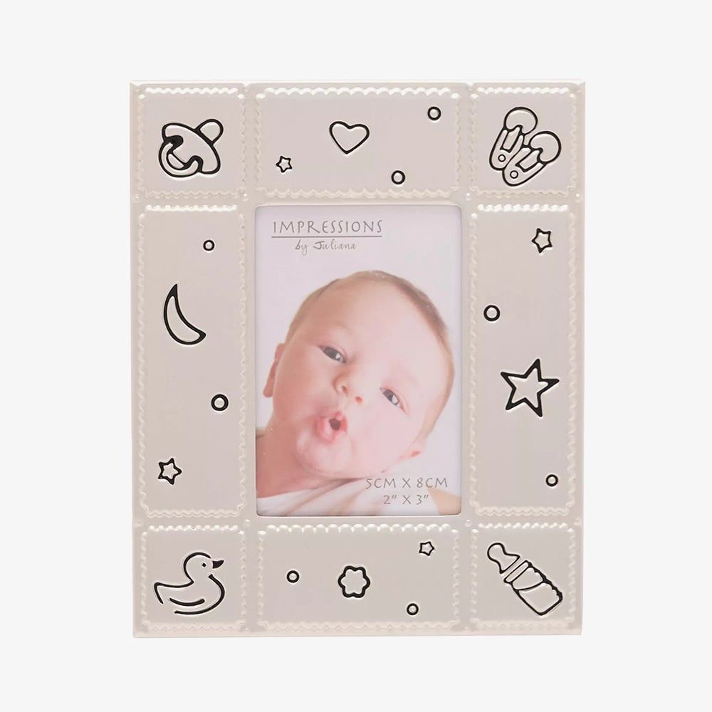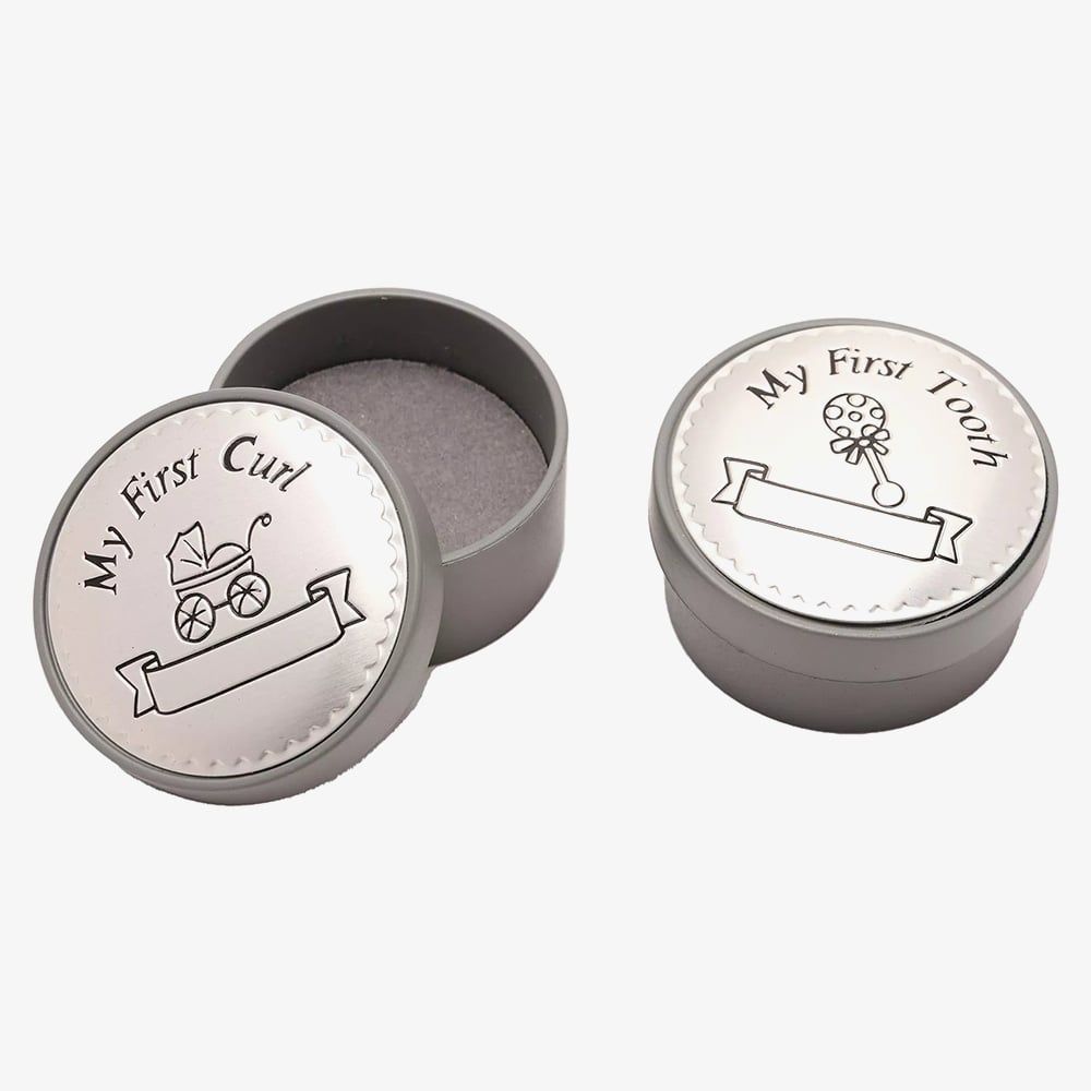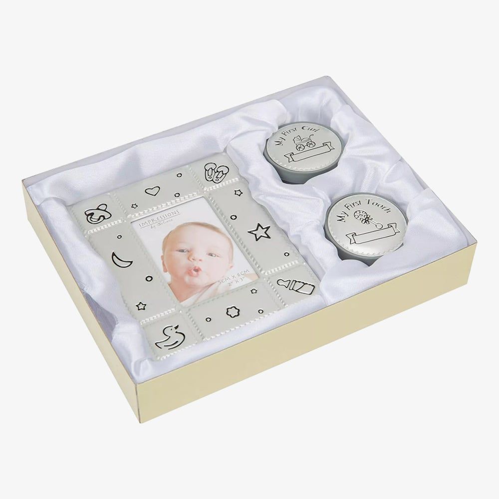 Cherish precious early memories with this delightful CELEBRATIONS® gift set, featuring a 2" x 3" photo frame and matching first tooth and first curl pots. Decorated with sweet baby icons, the frame makes a charming addition to any home. Beautifully presented in satin-lined packaging, it’s a thoughtful and sentimental gift for new parents.