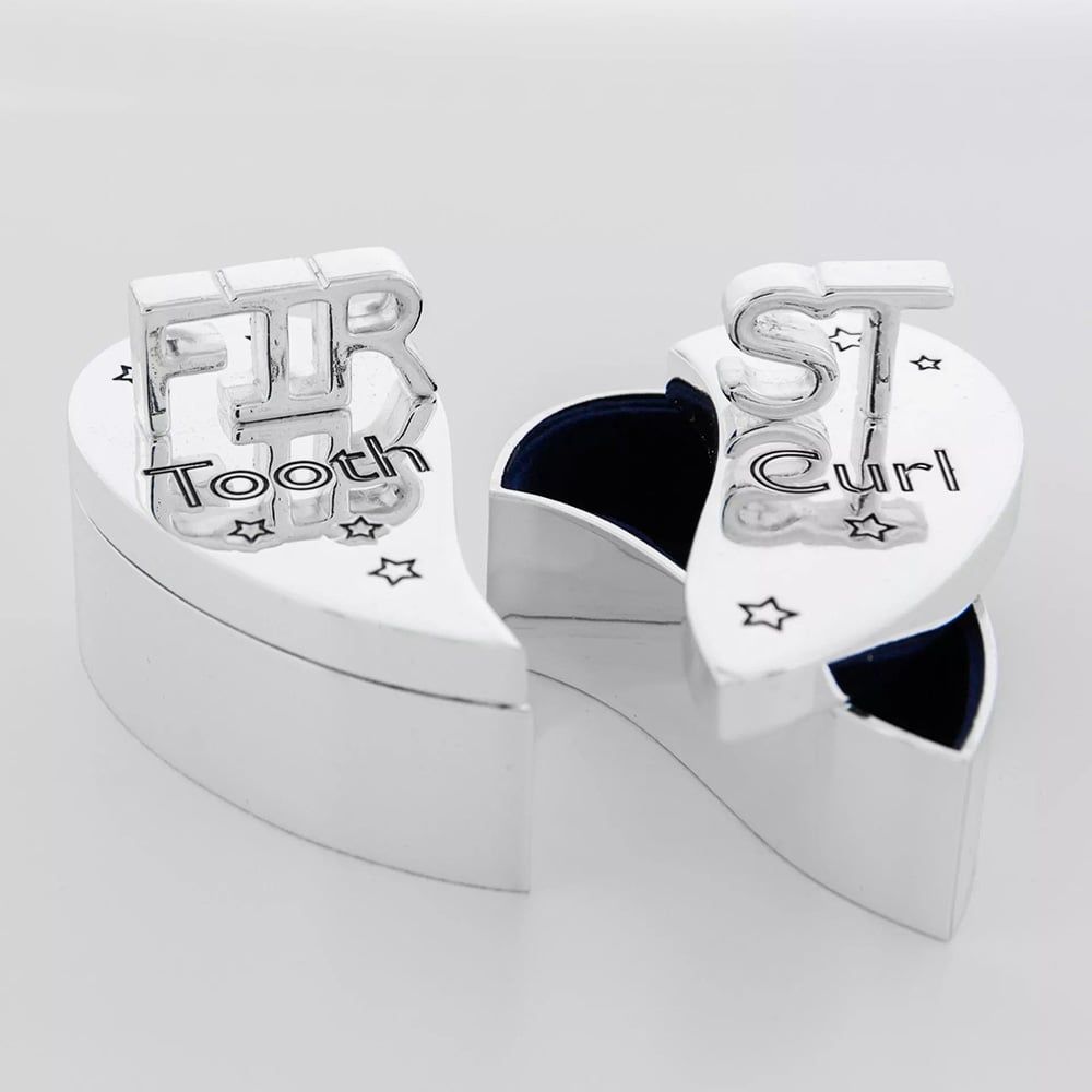 Treasure those precious early moments with this heart-shaped silverplated keepsake box from CELEBRATIONS®. The box splits into two halves—one for the first tooth and the other for the first curl—with the word “FIRST” elegantly standing across both sections. A charming and sentimental keepsake, perfect for preserving those unforgettable memories.