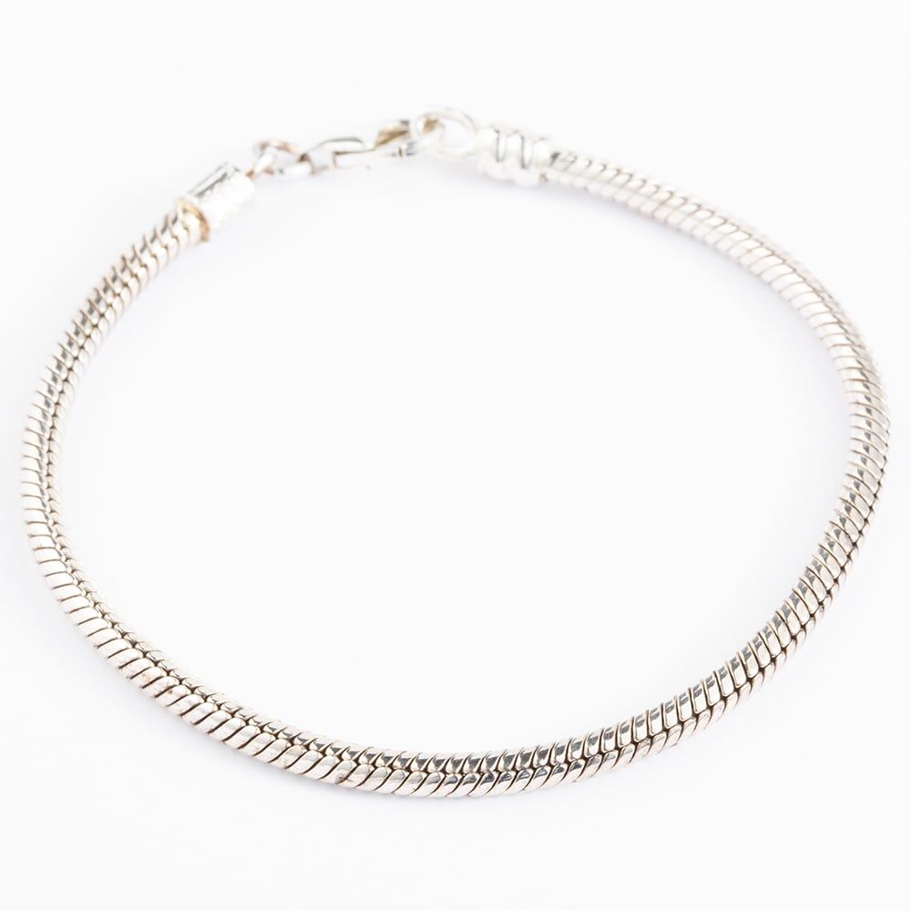 A sleek sterling silver snake chain measuring 17cm in length, designed with a secure lobster clasp for a polished and timeless look.