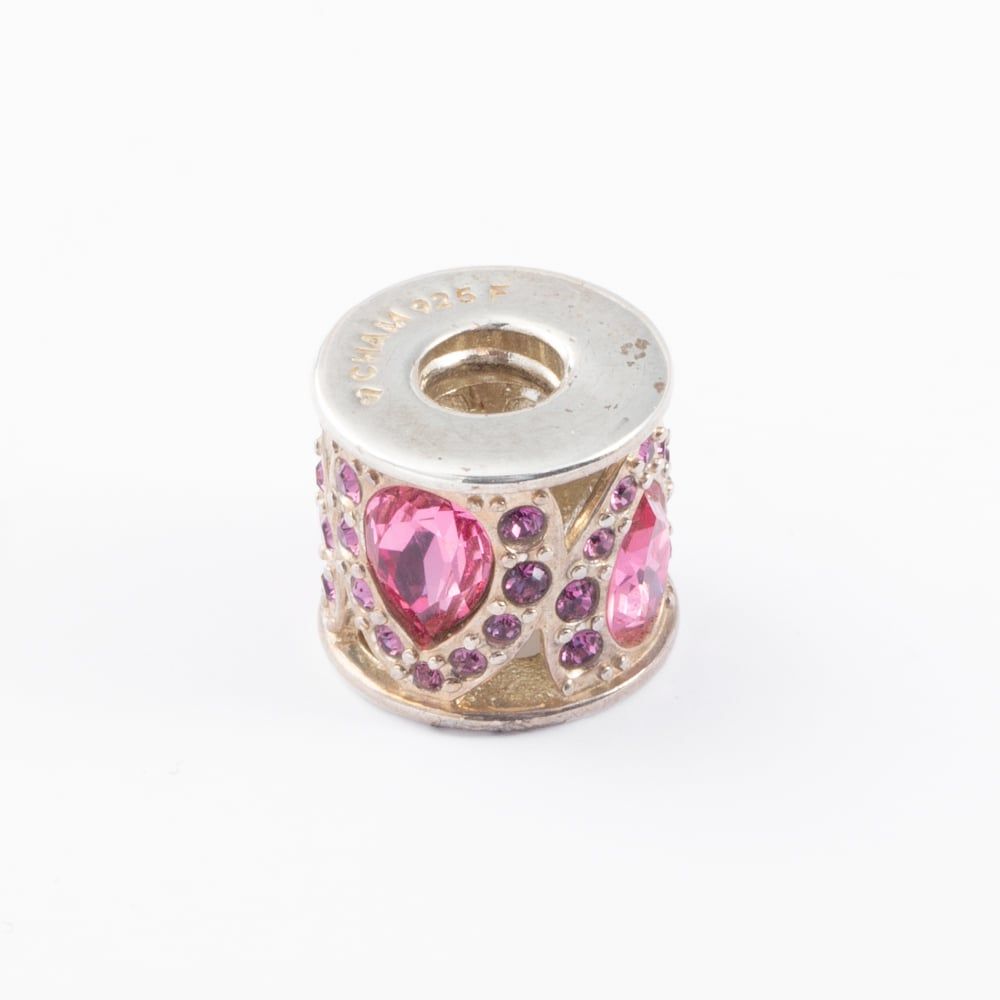 A stunning sterling silver bead charm adorned with sparkling pink and purple crystals, adding a touch of elegance and colour to any jewellery piece.