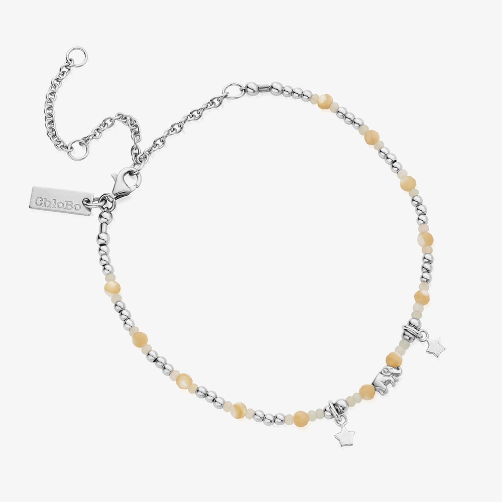 A gentle reminder of your inner power and unique magic, this sterling silver anklet features a delicate elephant charm nestled between two tiny stars. Symbolizing wisdom, resilience, and protection, it serves as a guiding light on your journey. Accented with mother of pearl beads and amazonite, this enchanting piece brings balance, direction, and a touch of serenity to every step you take.