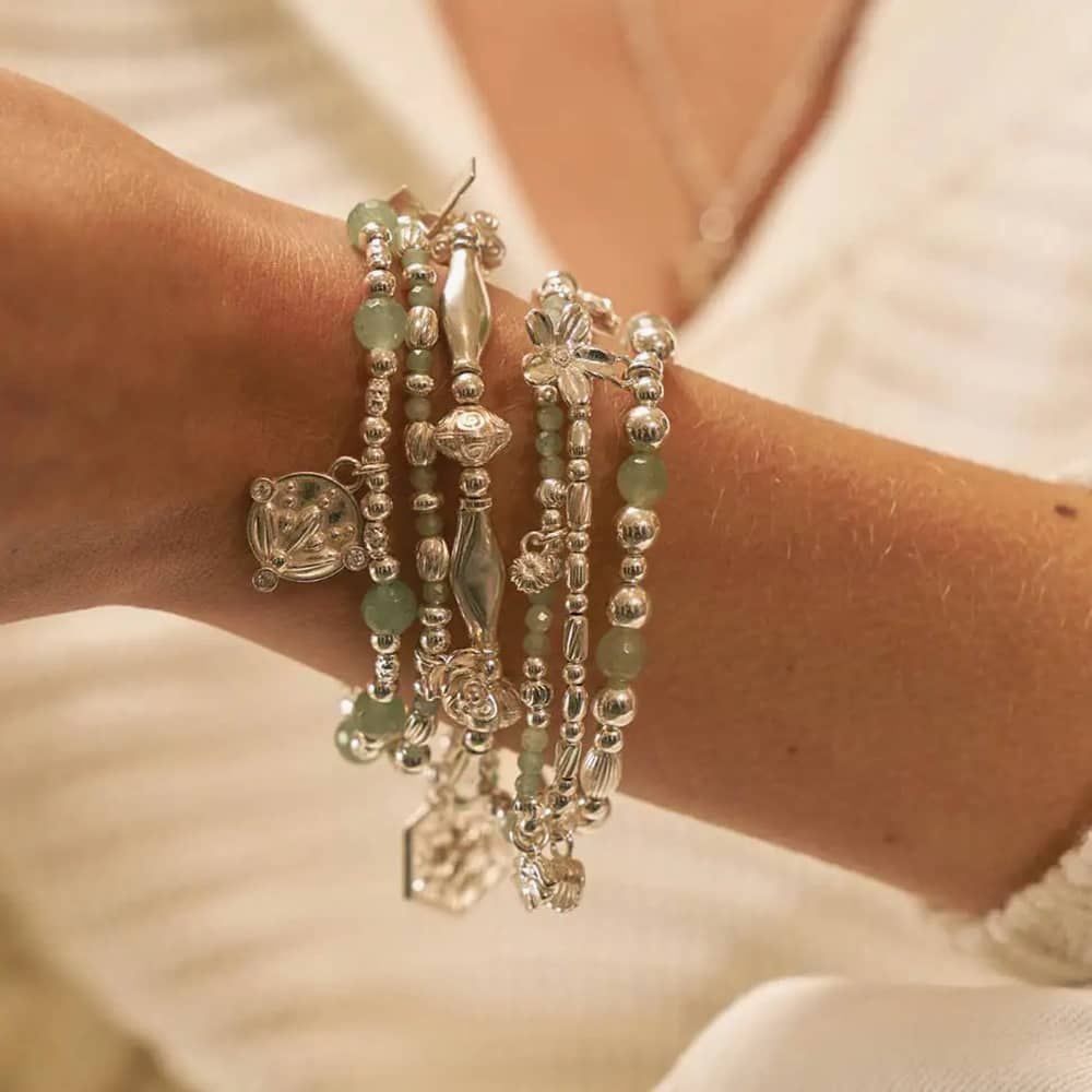 Sparkling with delicate silver blossoms and calming aventurine beads, this bracelet is a symbol of letting go. As you wear it, imagine releasing old habits and making space for personal growth and flourishing. The aventurine stones are believed to bring good luck and new possibilities, empowering you on your journey.