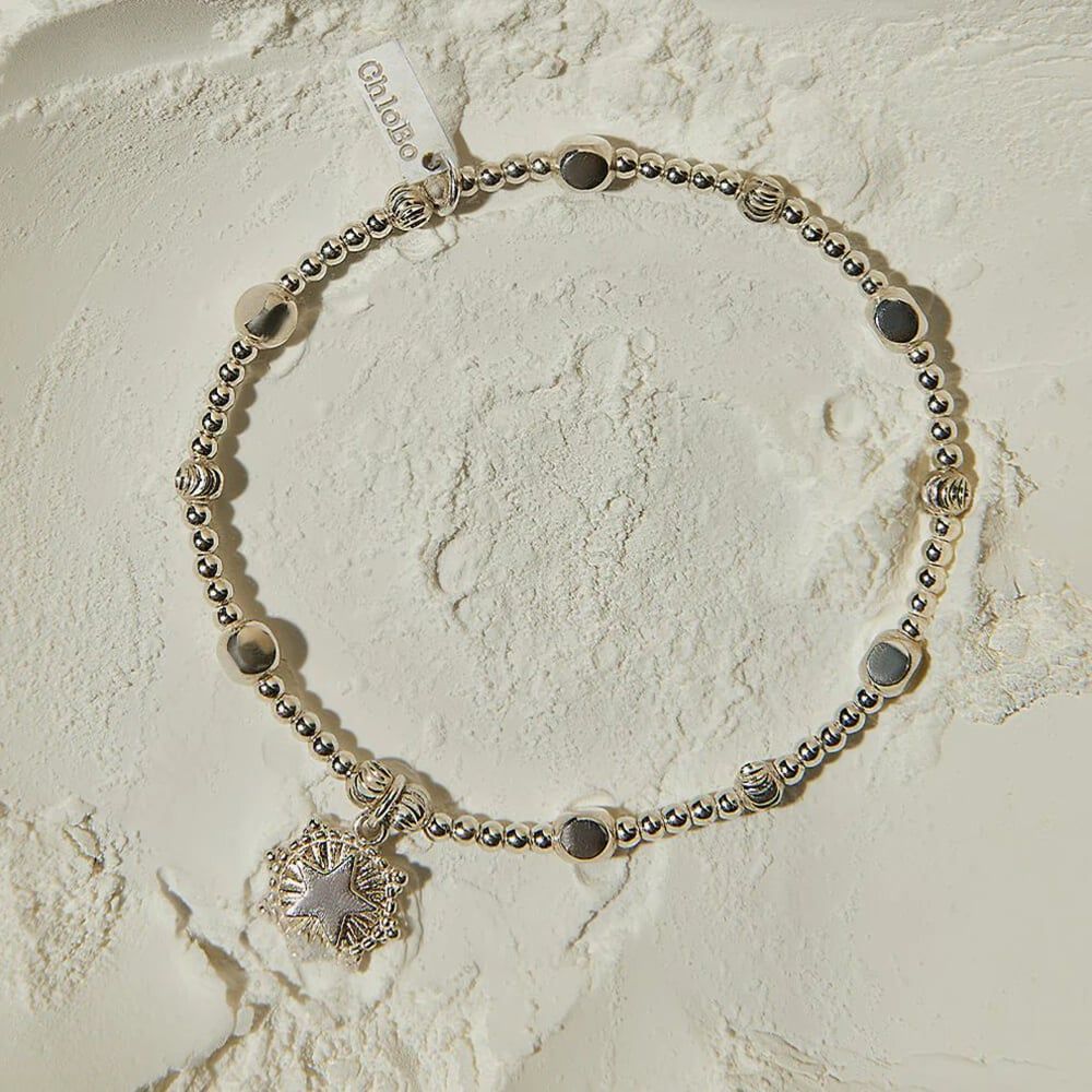 The ChloBo Radiant Essence Charm Beaded Bracelet, crafted from high-quality sterling silver, features intricately arranged beads and a delicate star dropper charm. This bracelet brings a touch of elegance and a hint of celestial charm to any outfit, perfect for adding a subtle sparkle and radiance to your everyday style.