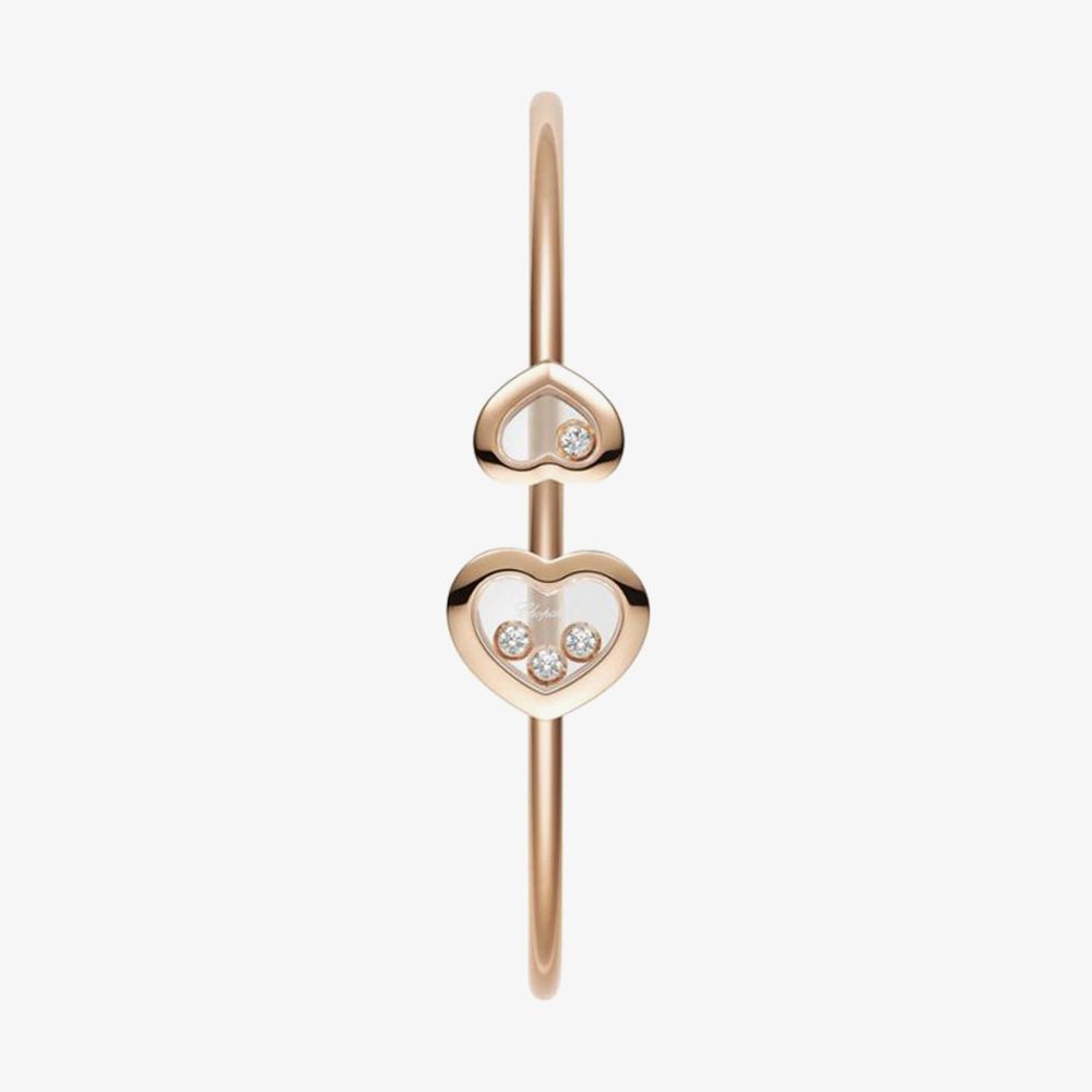 Inspired by the resilience and beauty of love, the 18ct Rose Gold Happy Hearts Diamond Bangle is a must-have for anyone seeking individual style and elegance. Made from a rigid 18ct rose gold open-style bangle, this delicate-looking bangle features two 18ct rose gold heart motifs embellished with four free moving diamonds set between sapphire glass in the Chopard 'dancing diamond' style, giving the wearer a full 0.80ct of diamond sparkle. Available in standard sizing, this bangle is set to suit anyone.