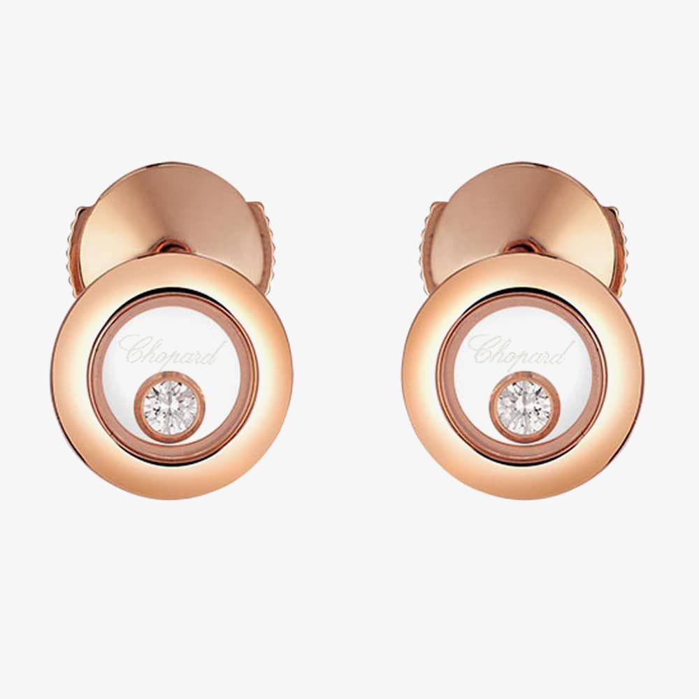 This beautiful pair of circular shaped stud earrings will add a touch of sparkle to any occasion. Crafted in 18ct rose gold, the earrings feature an openwork design of sapphire crystal casing which houses two 0.10ct free moving diamonds. Wear the earrings individually or pair with matching items from the Happy Diamonds collection to complete your look.
