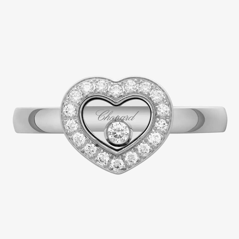 A gloriously crafted ladies ring which consists of a heart-shaped design. The heart shaped frame is set with eighteen 0.14ct sparkling diamonds stones which surround an alluring open work detail that is home to a free floating single 0.05ct diamond. Set upon an 18ct white gold band for the perfect finishing touch.