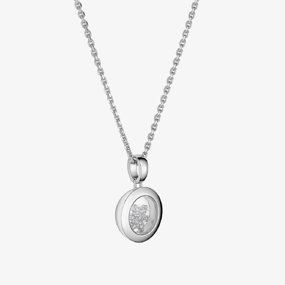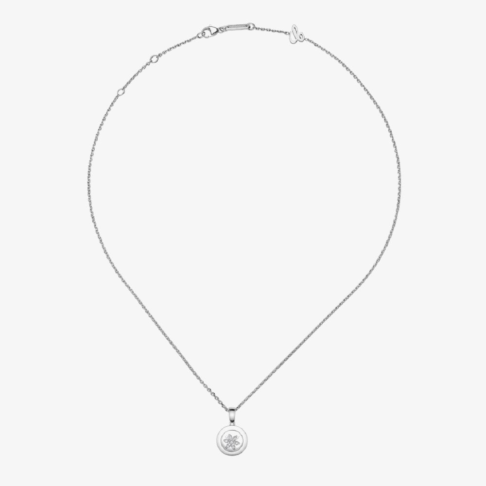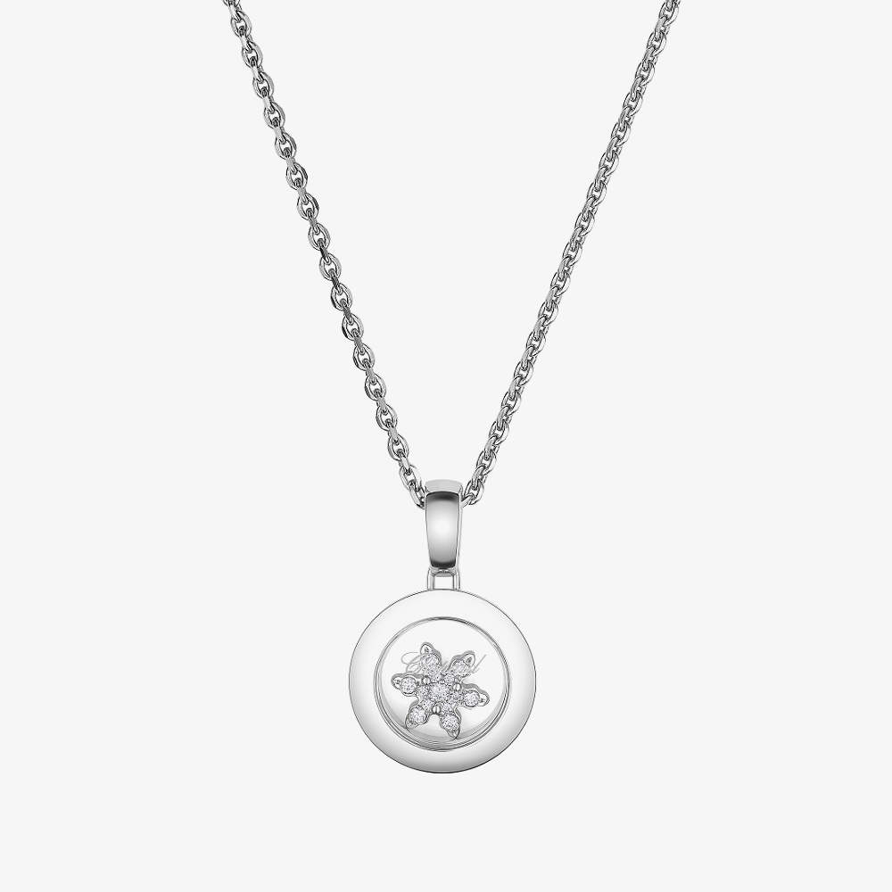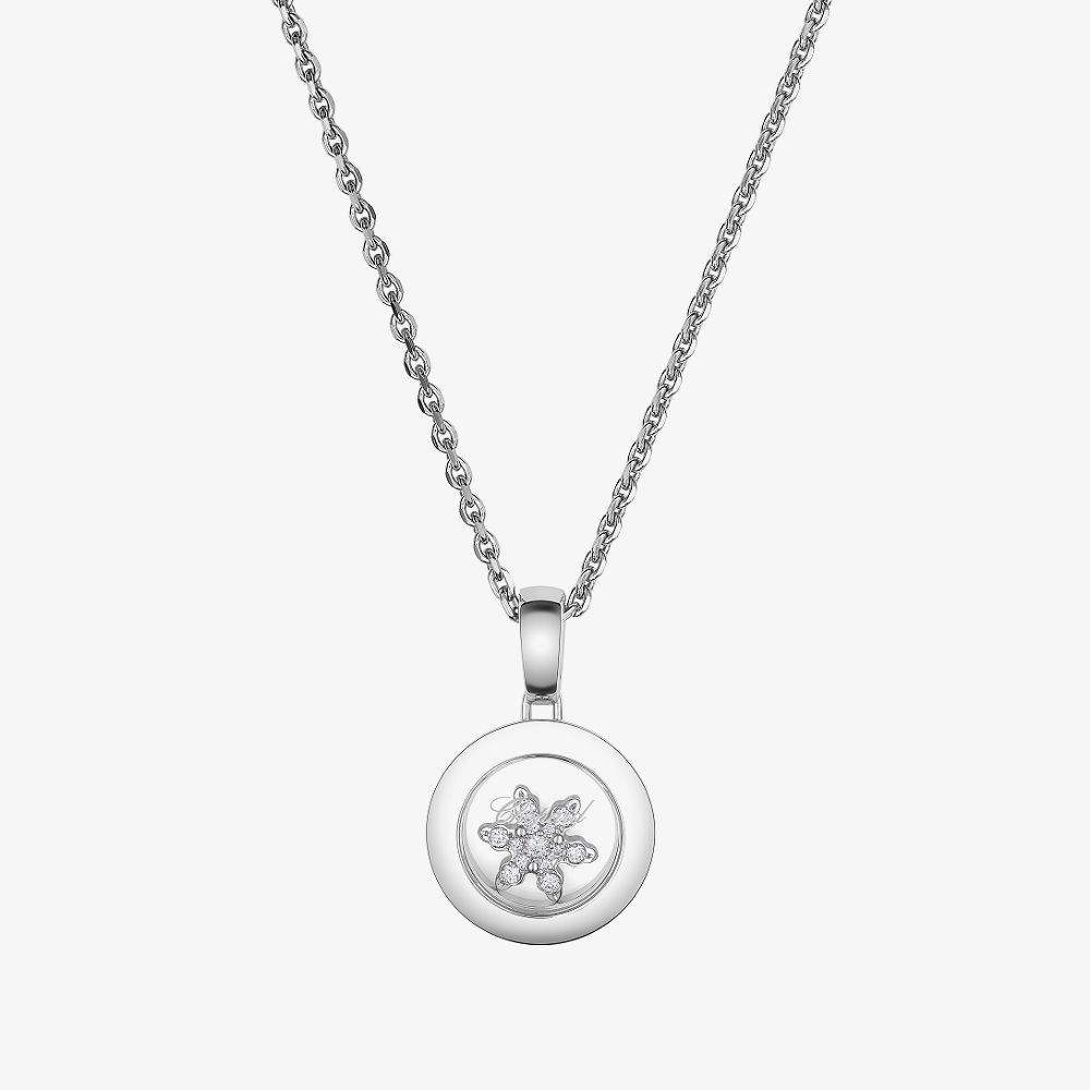 Inspired by the resiliance and beauty of love, the Chopard Happy Diamonds 18ct White Gold Diamond Necklace 79A018-1401 is a must-have for anyone seeking individual style and elegance. Made from 18ct white gold, this dainty-looking pendant necklace features a circular pendant with a 0.05ct, 13-diamond studded free-moving snowflake set between sapphire glass in the Chopard 'dancing diamond' style, giving the wearer a plenty of diamond sparkle. Beautifully adorned on a trace chain, this necklace will brighten up any occasion.