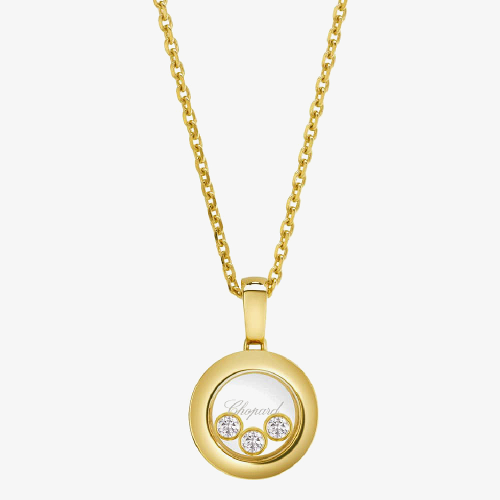 Add this sparkling trio of moving diamonds to your outfit with this gorgeous necklace from Chopard. Consisting of an 18ct yellow gold 42cm chain and matching round pendant which protects the sapphire crystal glass.