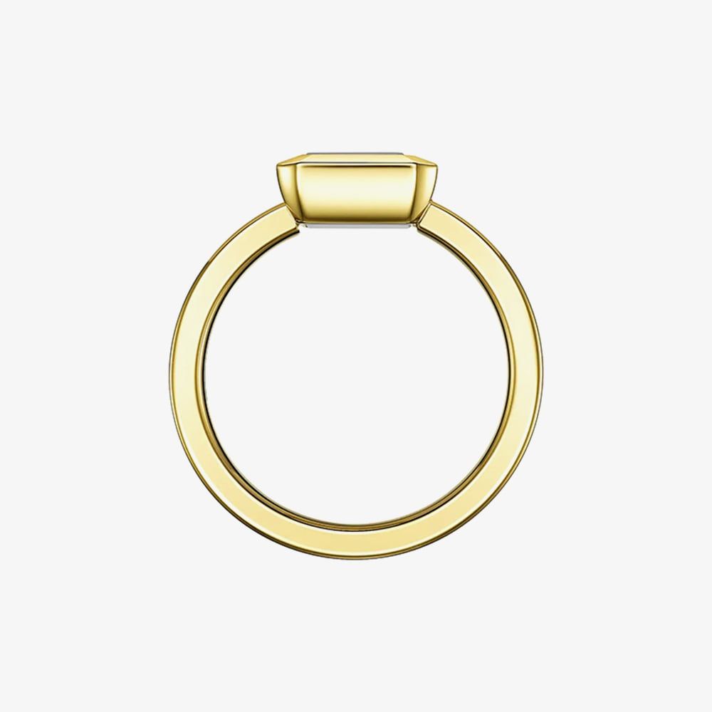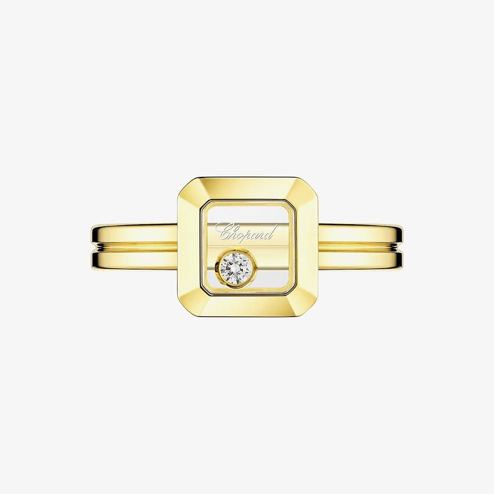 This Chopard Happy Diamonds ring is crafted from 18ct yellow gold and features a sleek square design. At its centre, a 0.05ct floating diamond is elegantly encased between layers of sapphire crystal glass, offering a signature touch of playful movement and timeless sophistication.