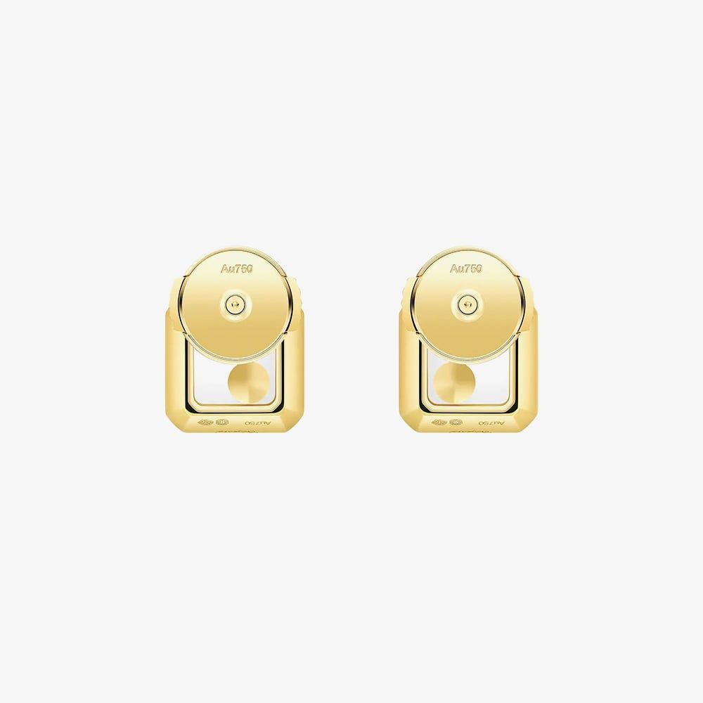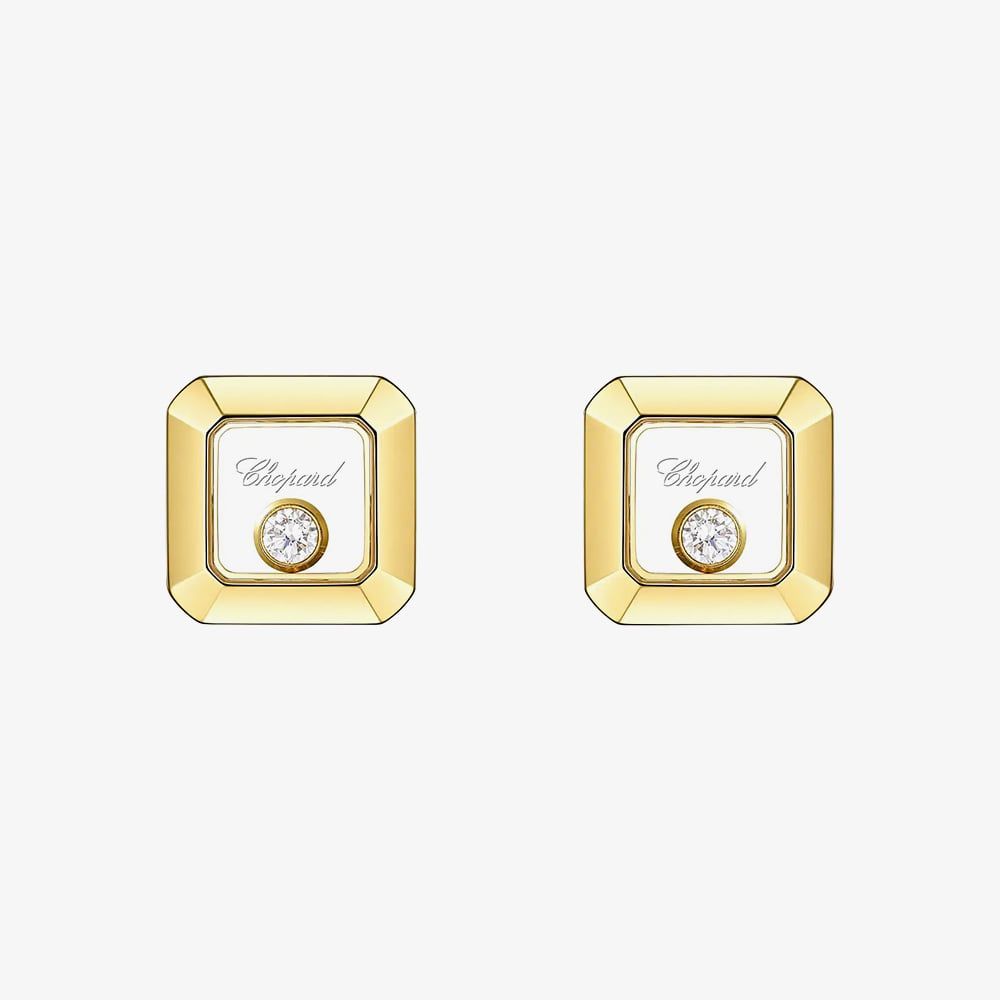These Chopard Happy Diamonds stud earrings are crafted in 18ct yellow gold and feature a modern square design. Each earring showcases a 0.10ct floating diamond encased between layers of sapphire crystal glass, creating a playful yet elegant sparkle with every movement. A signature of Chopard’s joyful spirit and refined craftsmanship.