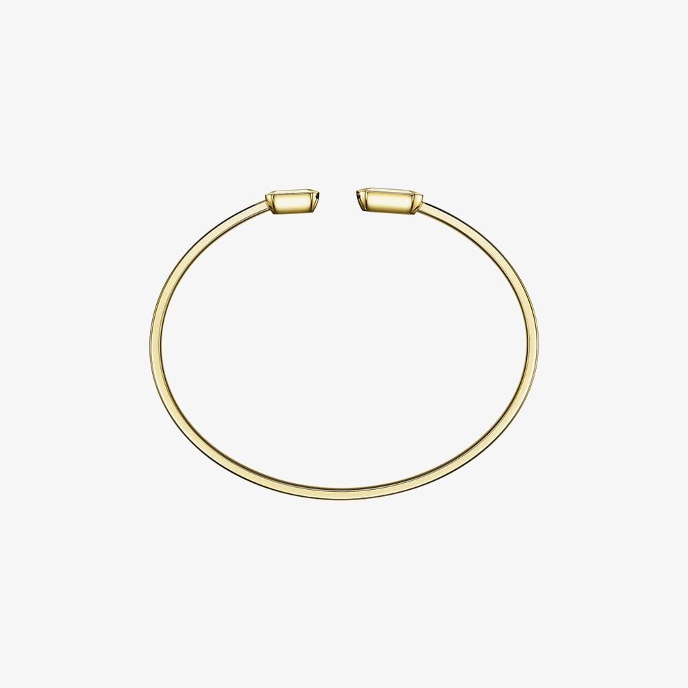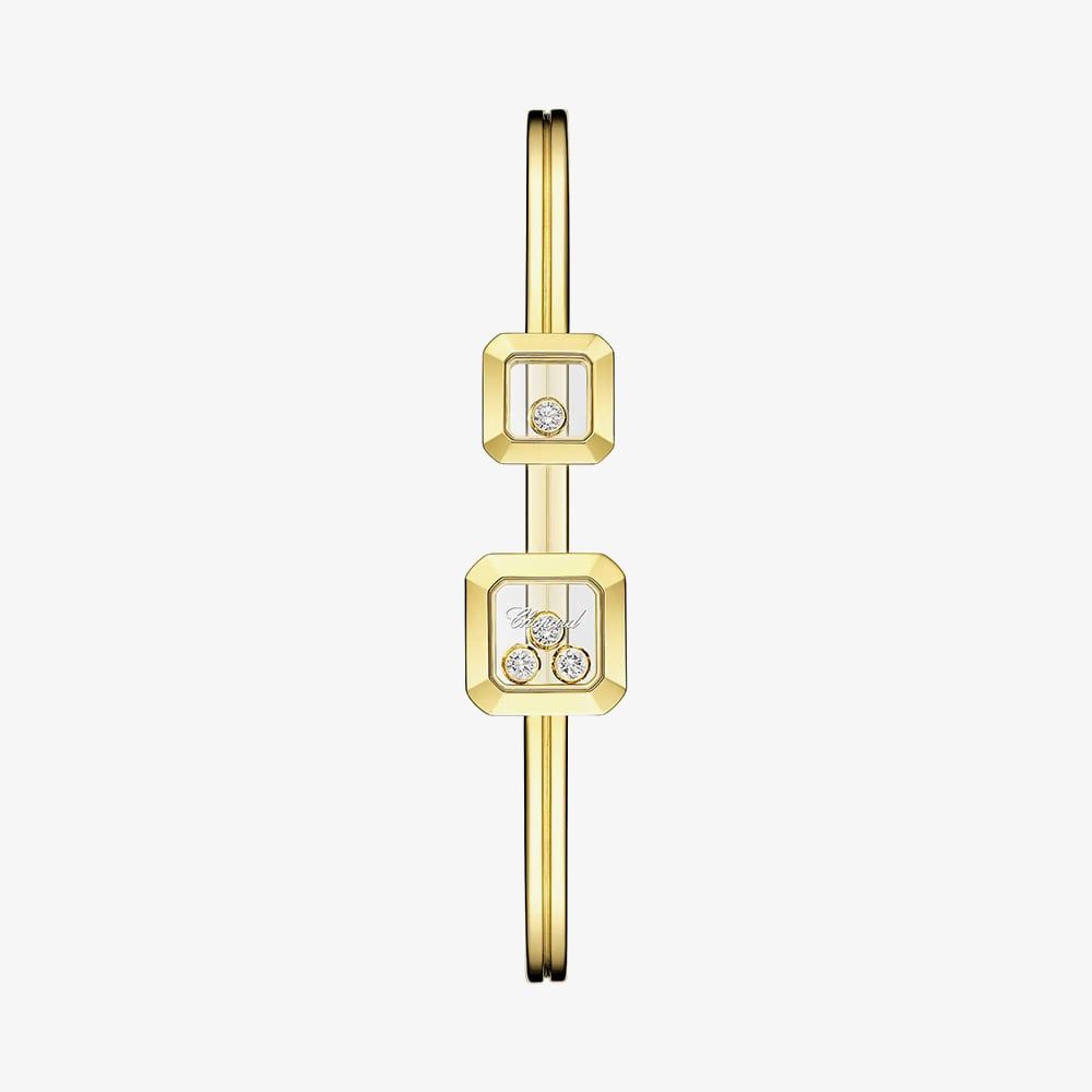 Elegant and radiant, this Chopard Happy Diamonds Icons bangle is crafted in polished 18ct yellow gold and features the Maison’s iconic floating diamonds. At each end, sapphire crystals encase brilliant diamonds, one side with a single floating diamond, the other with a trio, all dancing freely with every movement.